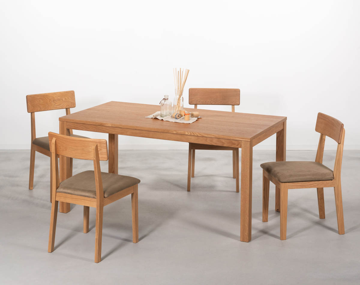 エッジの効いた直線的なデザインのダイニングテーブルです。オークの木目が際立つ突板貼りの天板と、重厚感のあるオークの脚部が魅力です。どのカラーもモダンで上品な雰囲気で、置くだけで空間を引き締めます。