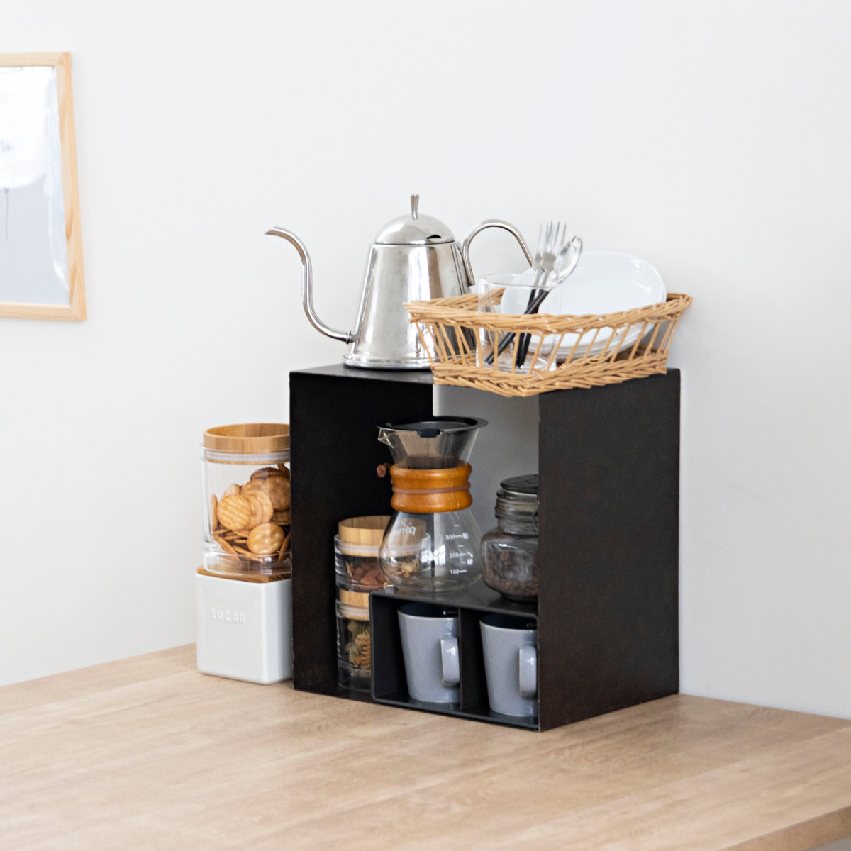 花瓶をひとつ置くだけでも立体感が生まれ、空間にメリハリが生まれます。スパイスラックや収納としても活躍します。インテリアに調和しながら、暮らしに機能をプラスする一品です。