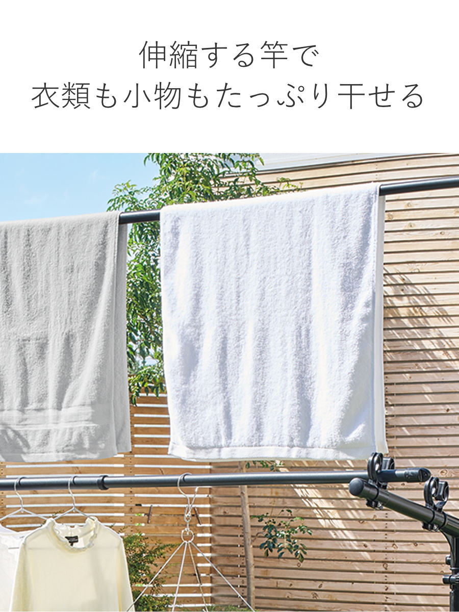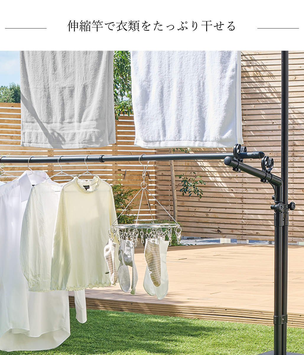 伸縮する竿なので、衣類から布団まで様々な物を干すことができます。干す物や場所に合わせて1.7m~2.3mまで調整が可能です。