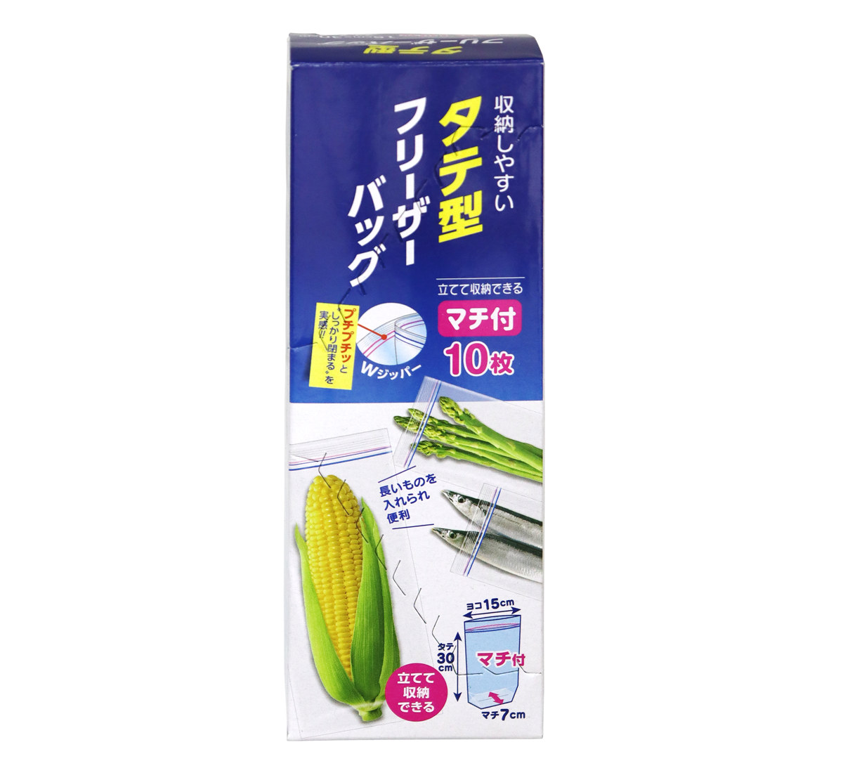 冷凍から電子レンジ解凍までご使用いただける、フリーザーバッグ10枚入りです。タテの長さが約30cmあるので、長い食材の保存にぴったり。マチ付きなので立てたまま収納できます。Wジッパー採用でしっかり閉まります。