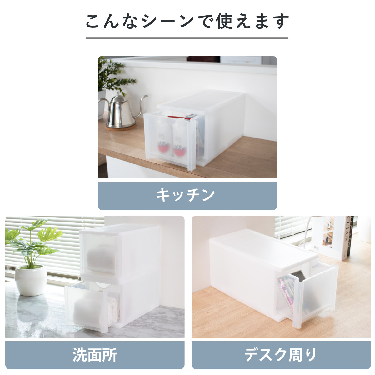 家中どこにでも設置しやすいシンプルなデザインです。キッチンでは食品のストックの収納、洗面所ではタオルやコスメの細かいアイテムの収納、デスク周りでは文具や充電コードを、まとめて整理することができます。