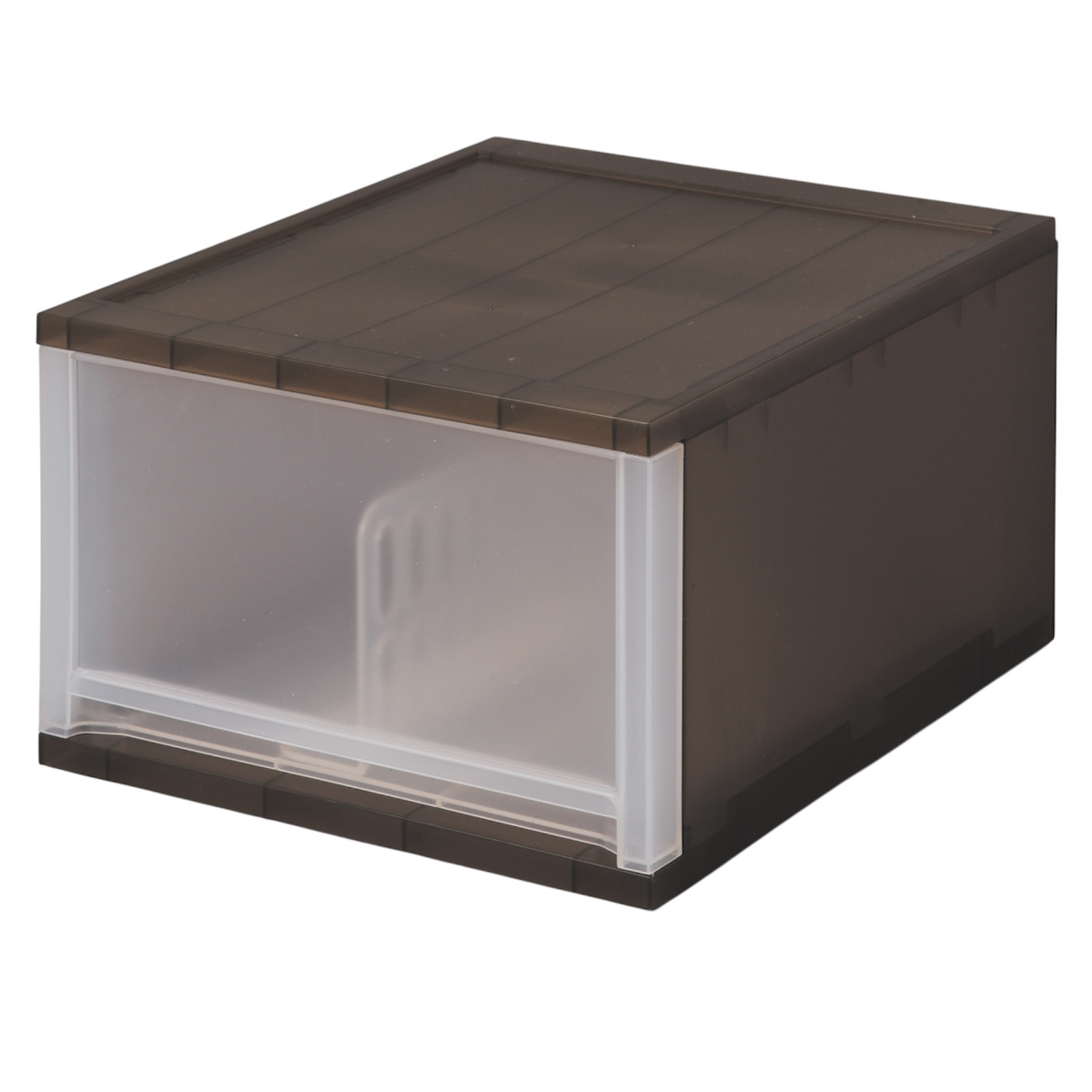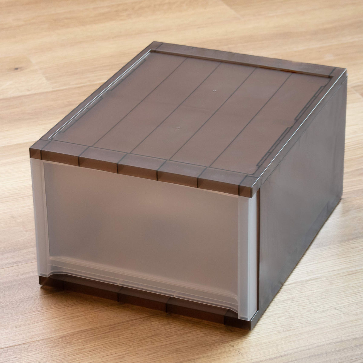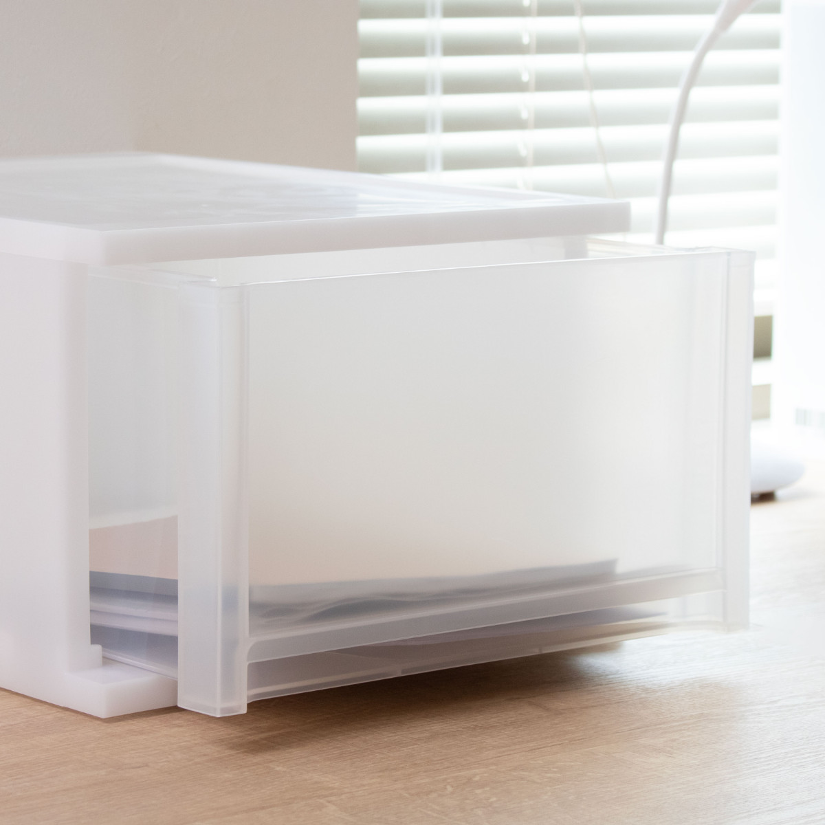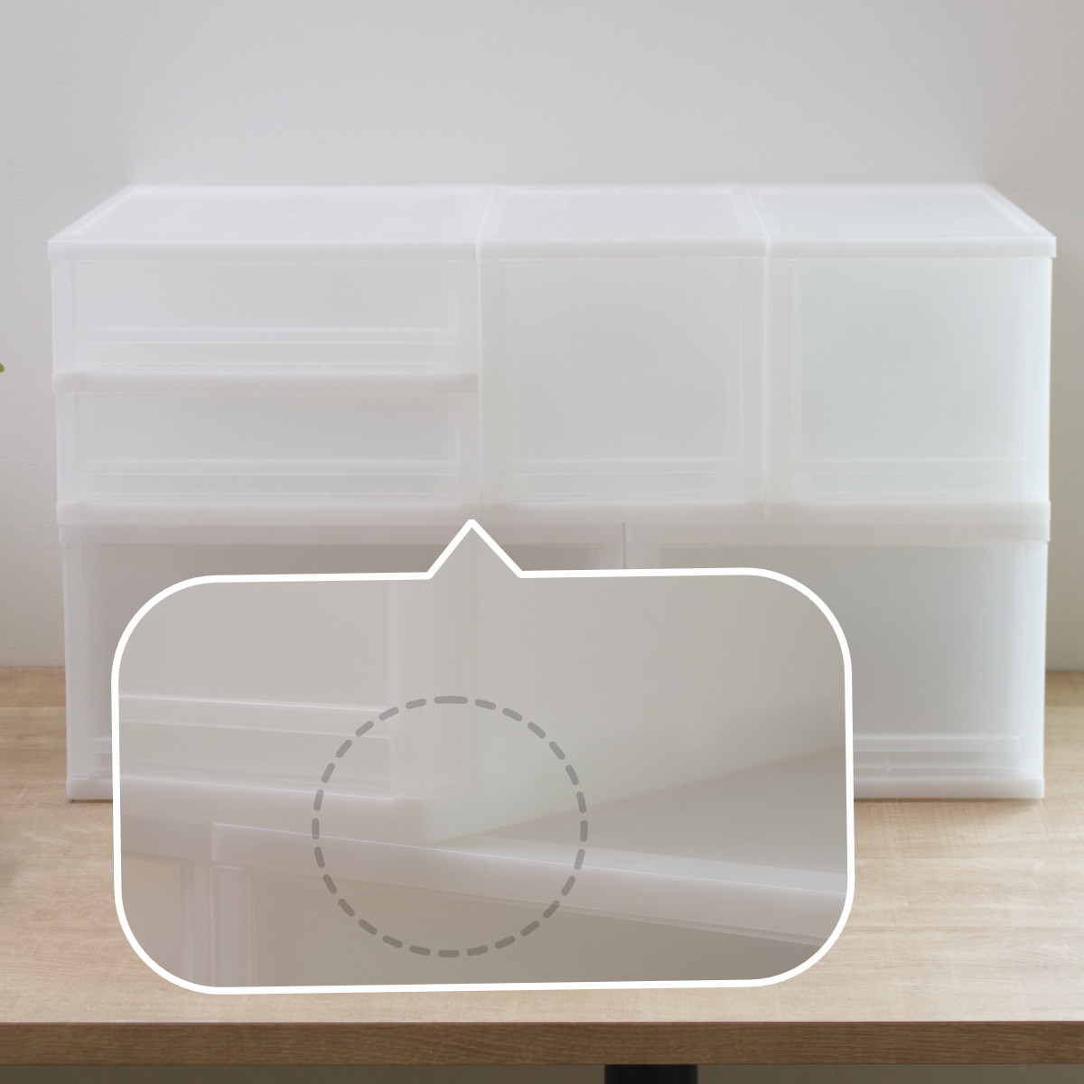 同じシリーズのスリムサイズやA4ケースと合わせて使うとスッキリ統一感のある印象に。BRIOシリーズは奥行と高さが同じなので、幅が違うサイズでも積み重ねることができます。底面と天板の凹凸がフィットする構造だから、積み重ねてもズレにくく安心です。