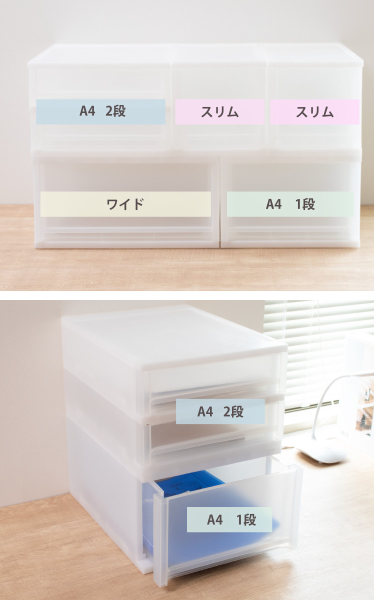 ![]() スリム【幅18cm】同色4個セット | ![]() ワイド【幅36cm】同色4個セット | ![]() A4 1段【幅27cm】同色4個セット 【▲このページの商品】 |