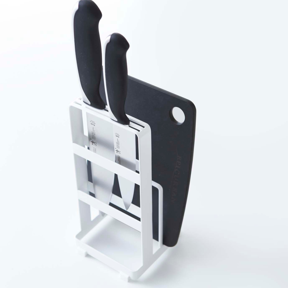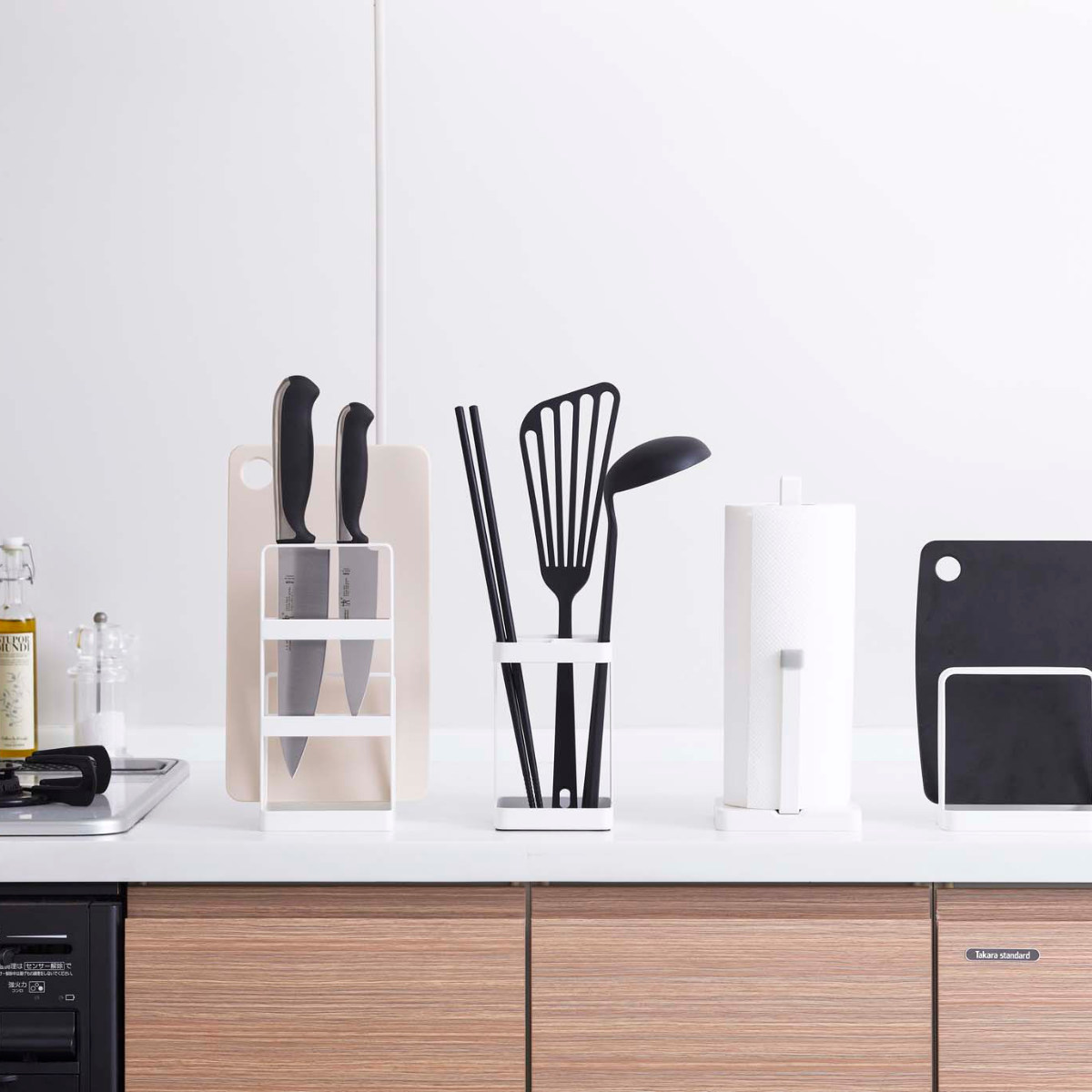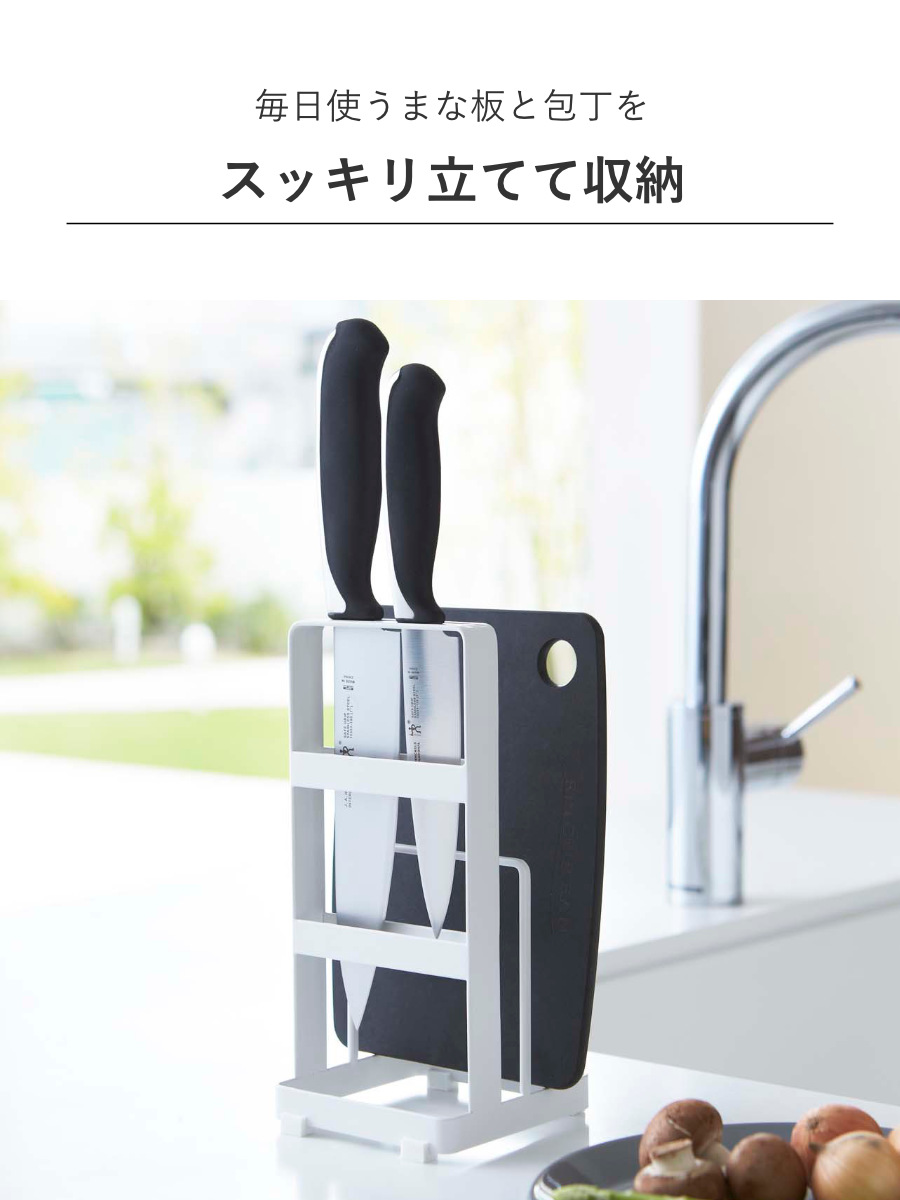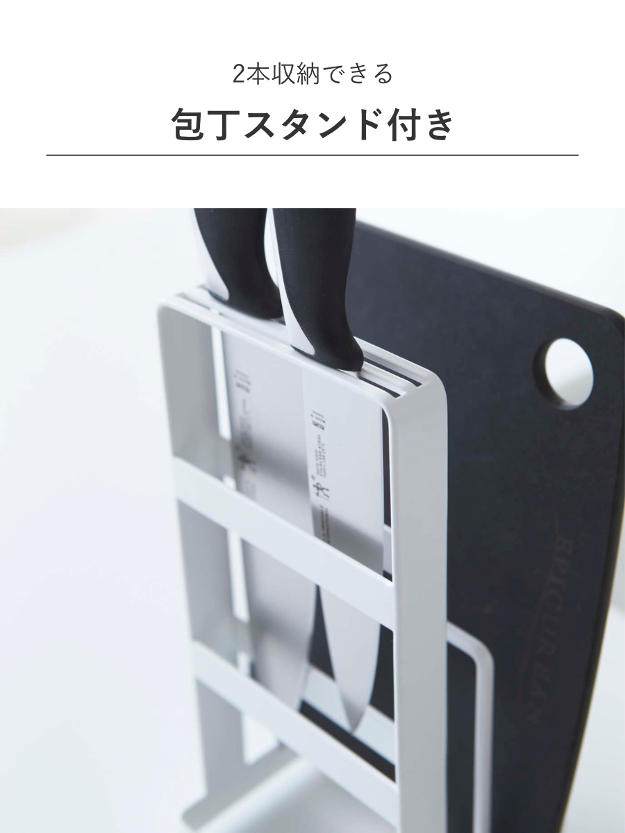 料理中に「使って、洗って、片付ける」を何回も繰り返すことも多いまな板と包丁が収納できるスタンドです。さっと取り出しやすく、風通しの良いシンプルなフレーム構造なので洗ったばかりの包丁やまな板の乾燥にも便利です。