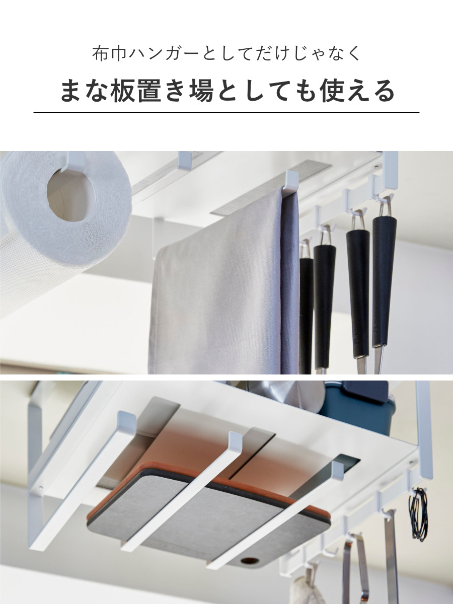 棚の下のスペースは布巾などを置掛けるのに便利なバーが2本付いています。布巾ハンガーとしてだけでは無く、まな板も置けるので省スペースでマルチにお使いいただけます。