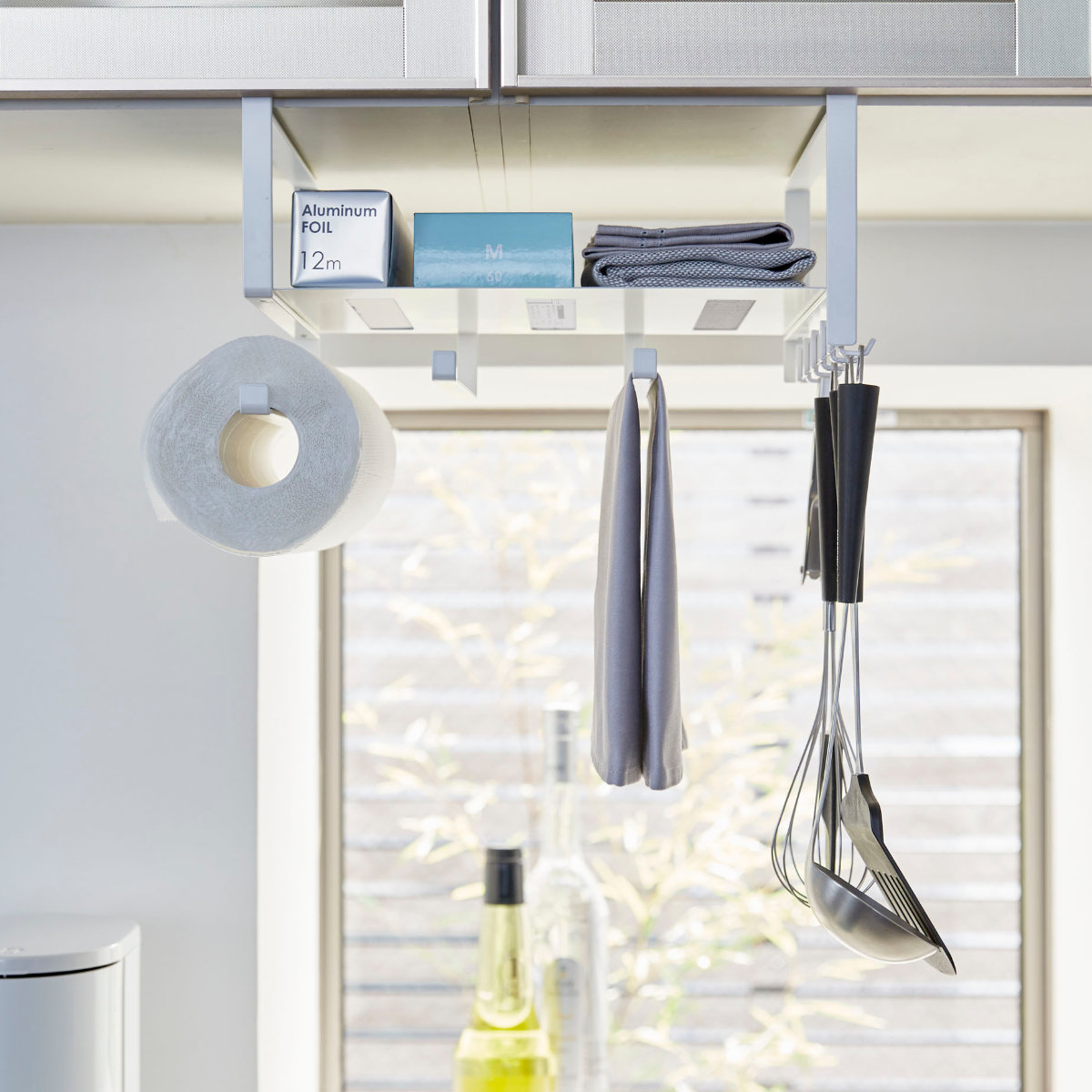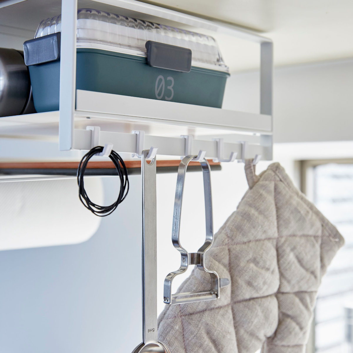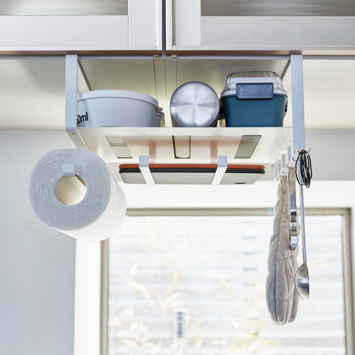 キッチンの吊り戸棚に差し込むだけで、簡単に設置できる多機能ラックです。よく使うキッチン小物やキッチンツールを手が届く位置にすっきり収納できます。今まで何も無かった戸棚下が収納スペースへと変わります。