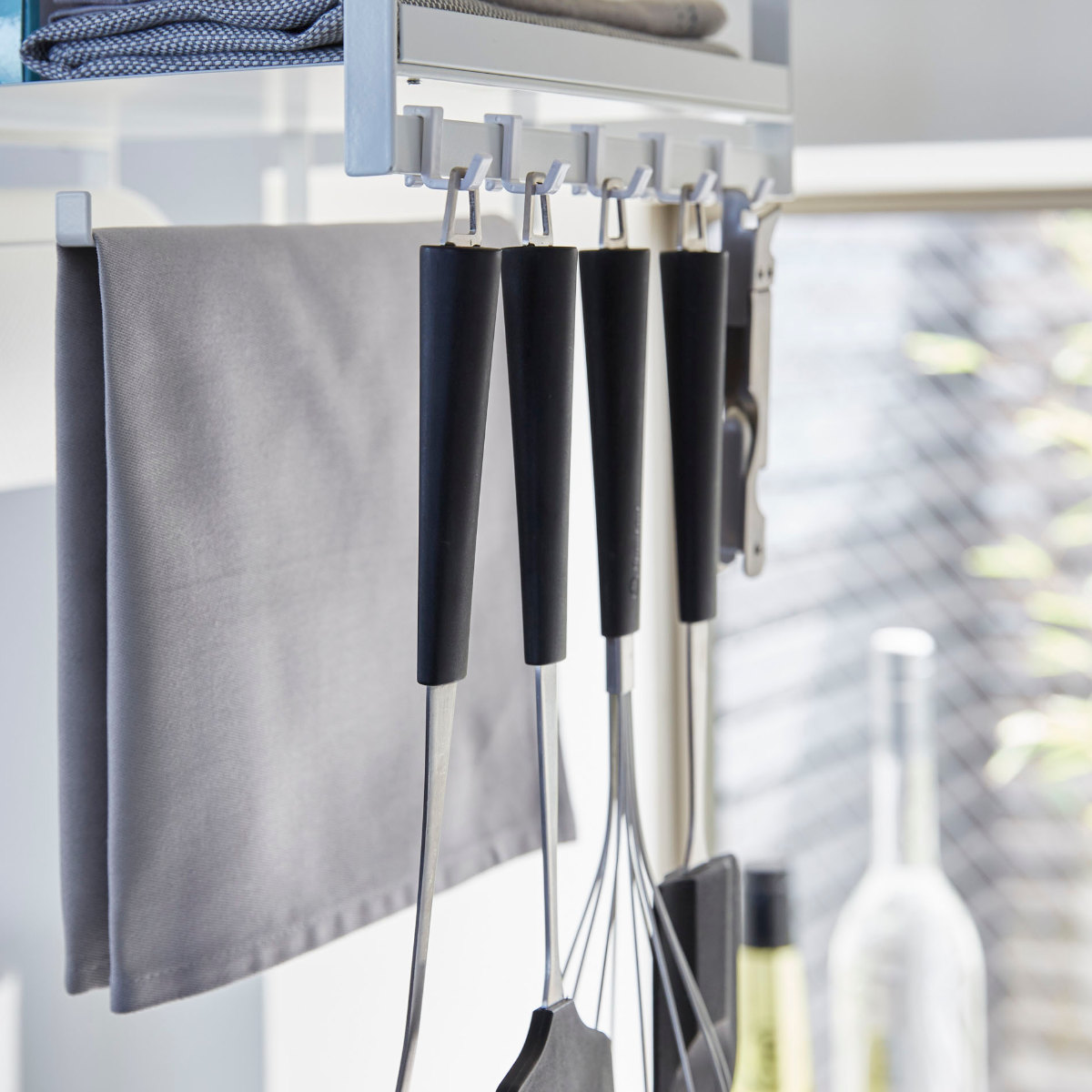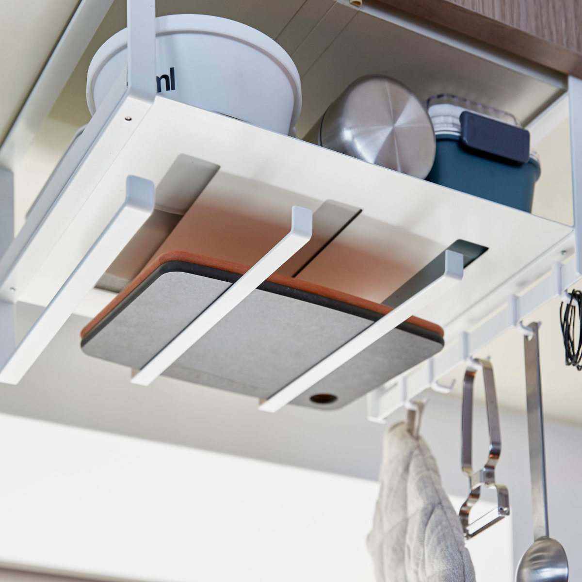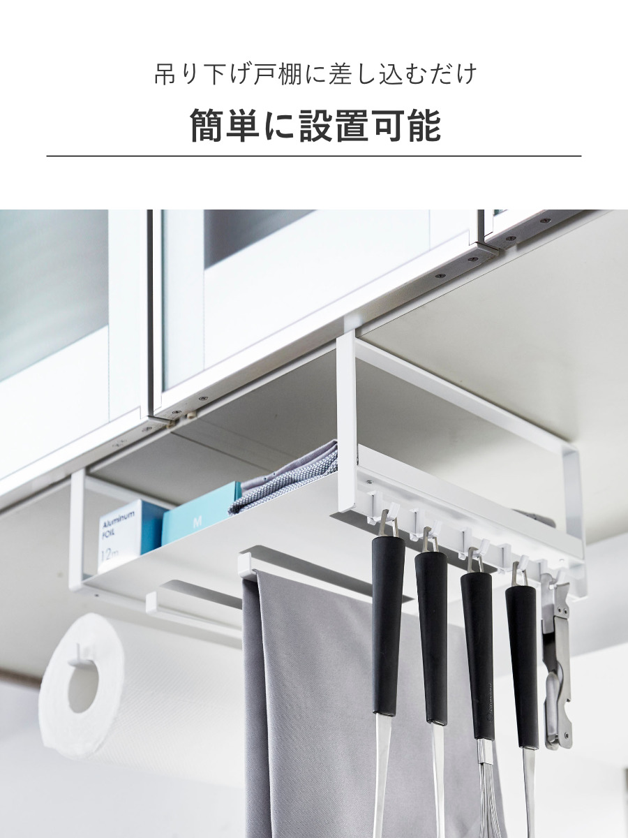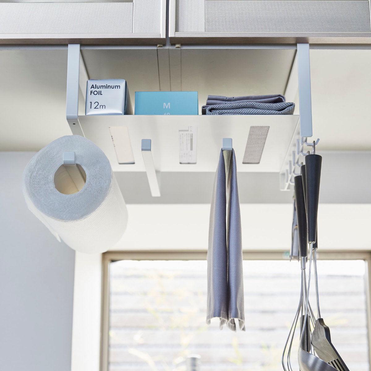 キッチンの吊り戸棚に差し込むだけで、簡単に設置できる多機能ラックです。よく使うキッチン小物やキッチンツールを手が届く位置にすっきり収納できます。今まで何も無かった戸棚下が収納スペースへと変わります。