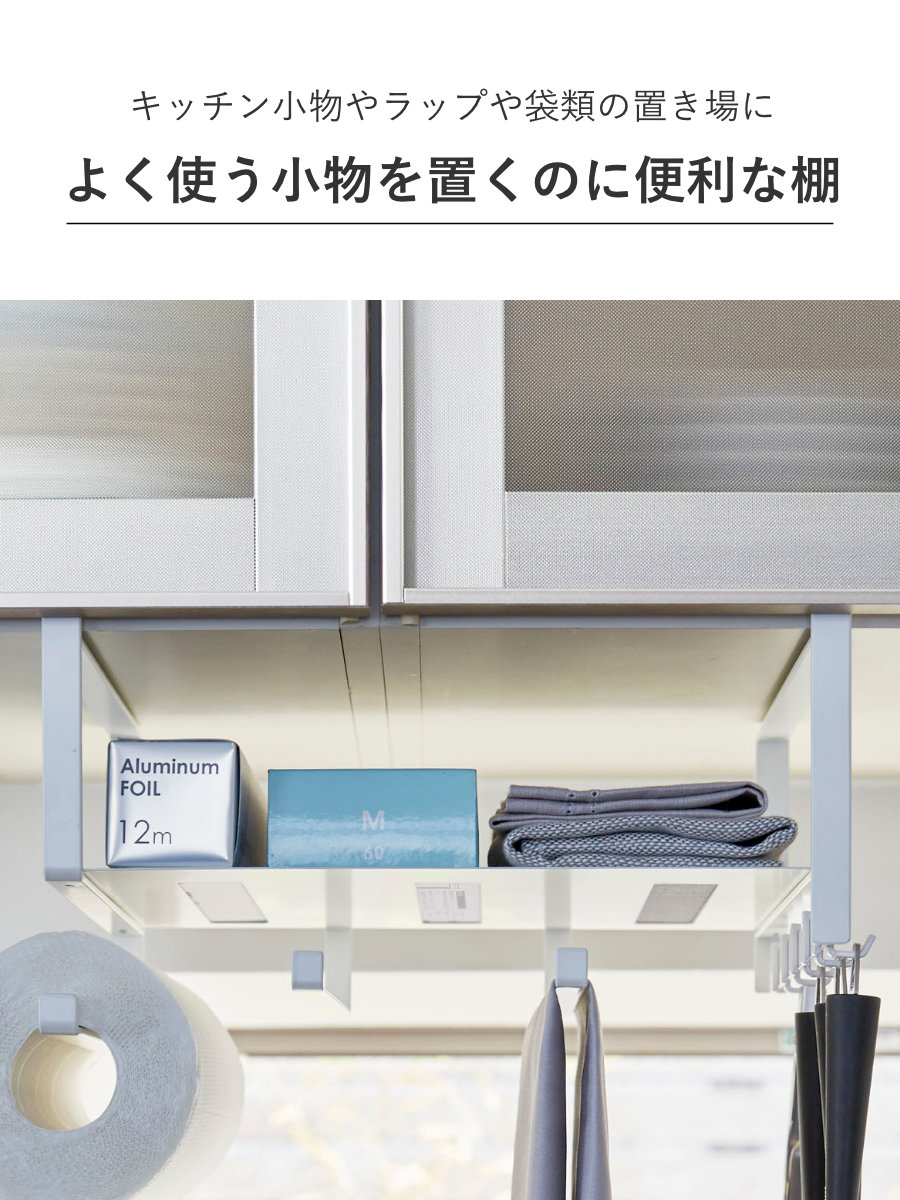 棚には水筒やベビーグッズ、ラップやゴミ袋などのキッチンアイテムや、よく使う調理器具などを収納するのに便利に使えます。一目でなにがあるか分かり、必要な時にサッと手に取ることができます。