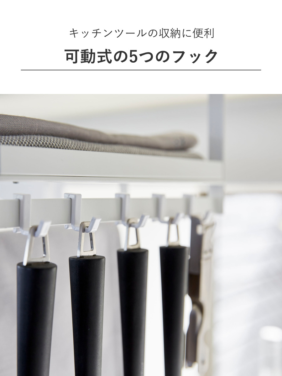 サイドには可動式のフックが5つ付いているのでお玉やトングなどのキッチンツールなどかけるのに便利です。フックの位置は収納する物の幅に合わせて場所を変えられます。