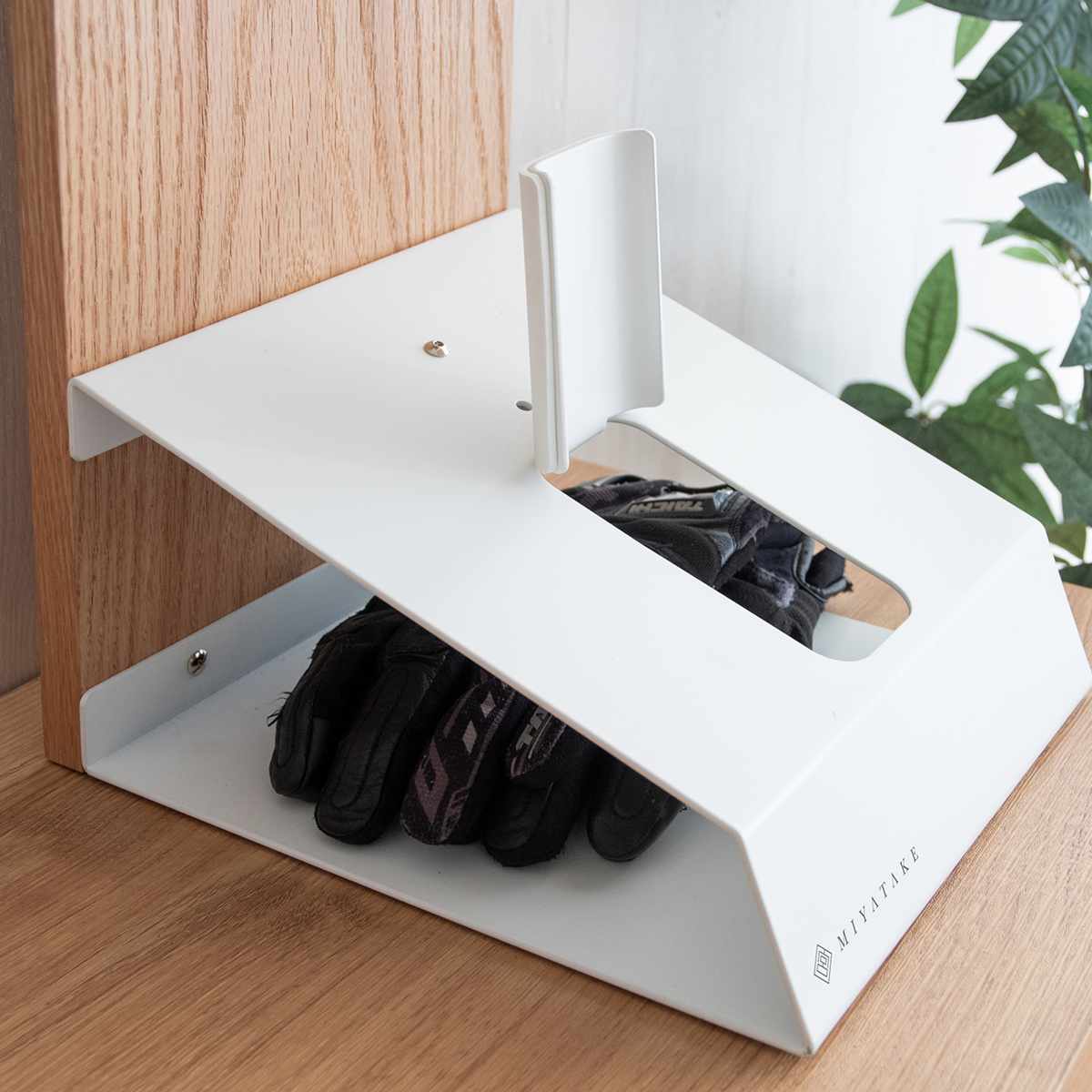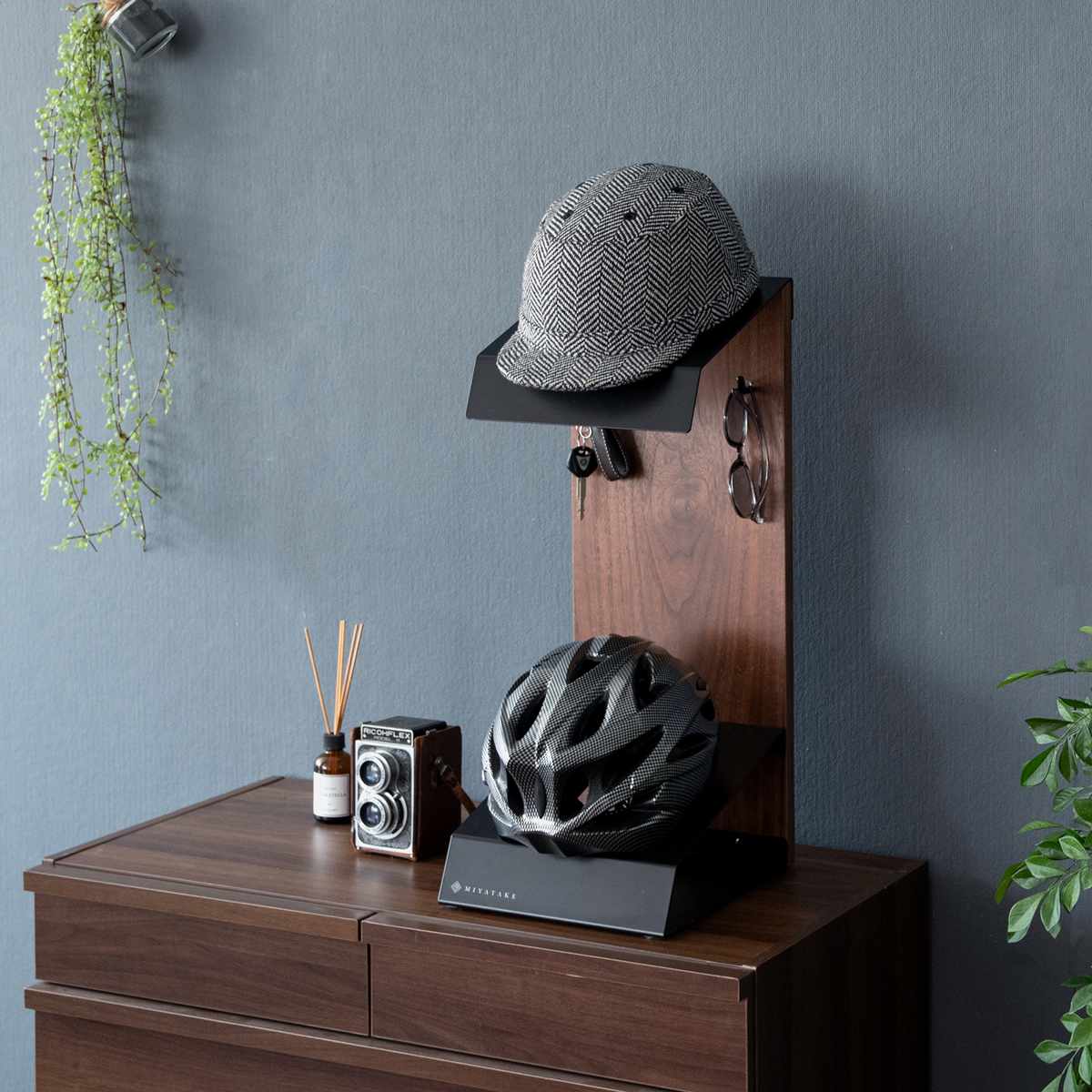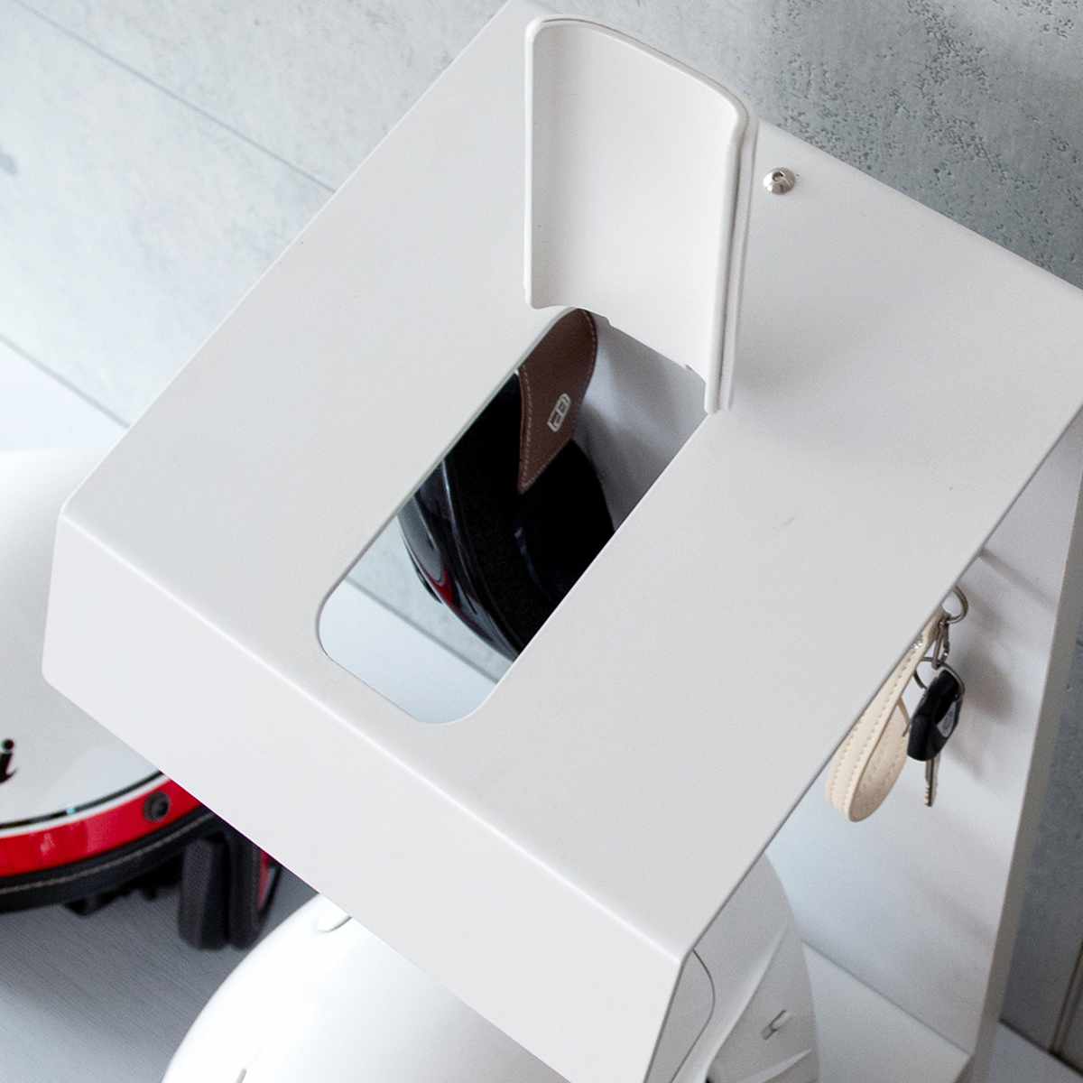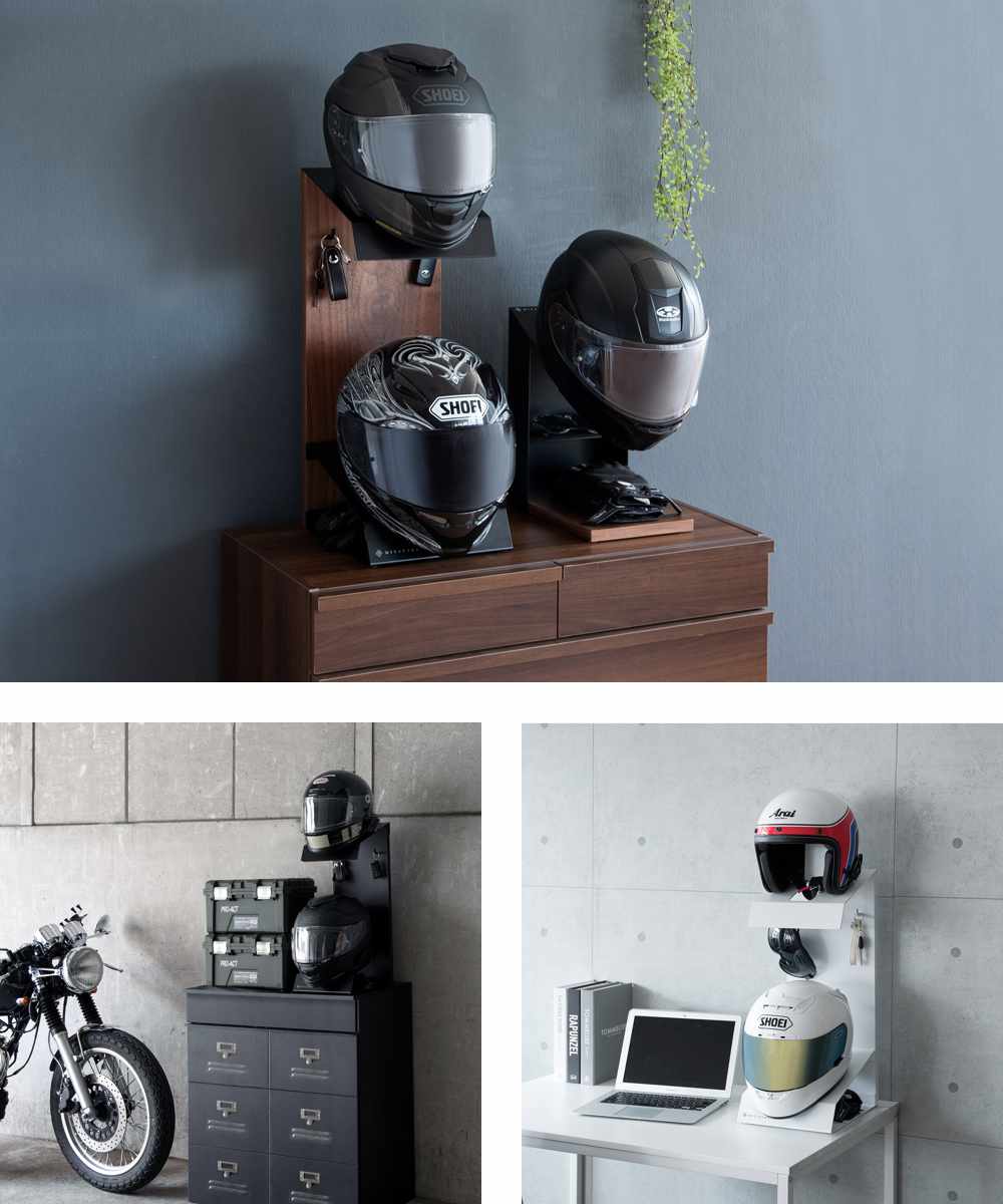 玄関はもちろん、リビングや書斎、ガレージにも設置可能。お気に入りのヘルメットをスタイリッシュに飾りながら収納できます。複数台並べれば、ヘルメットコレクションを楽しめるほか、ご家族のヘルメットをまとめて収納することもできます。