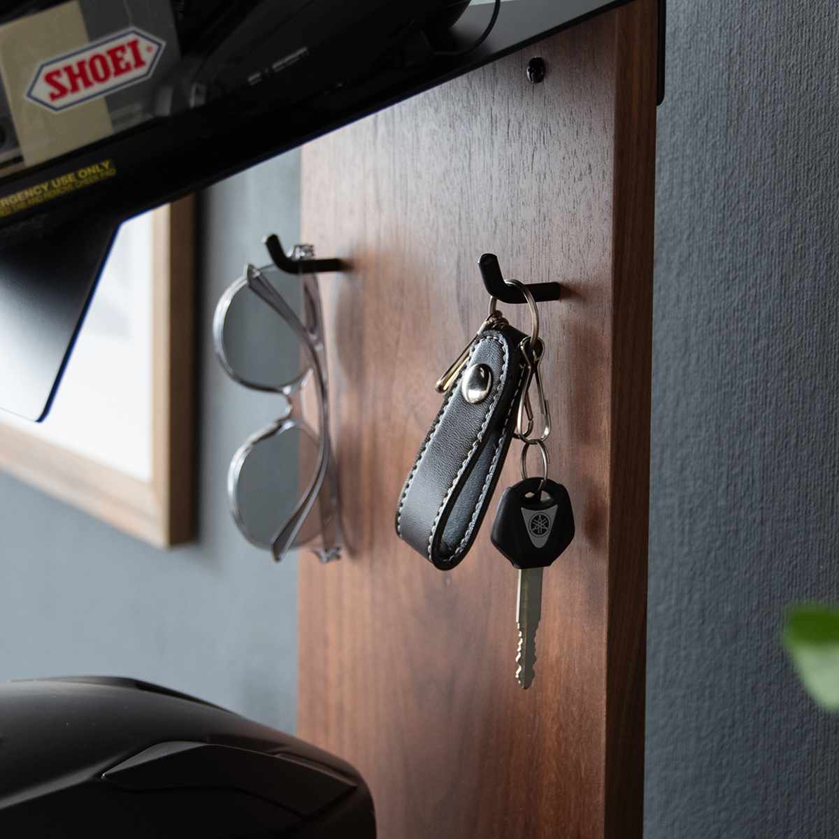 背面板には2本のフックが付いているので、バイクや車のキー、サングラスなどを掛けられて便利です。下段フック裏のスペースには、グローブなどをサッと置くことができます。
