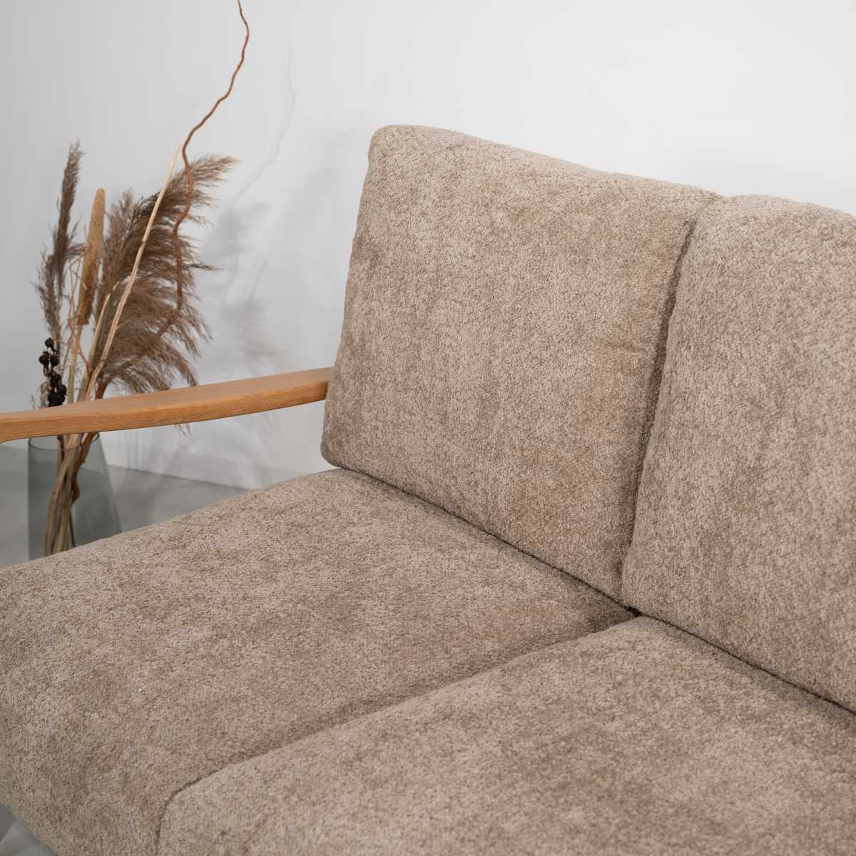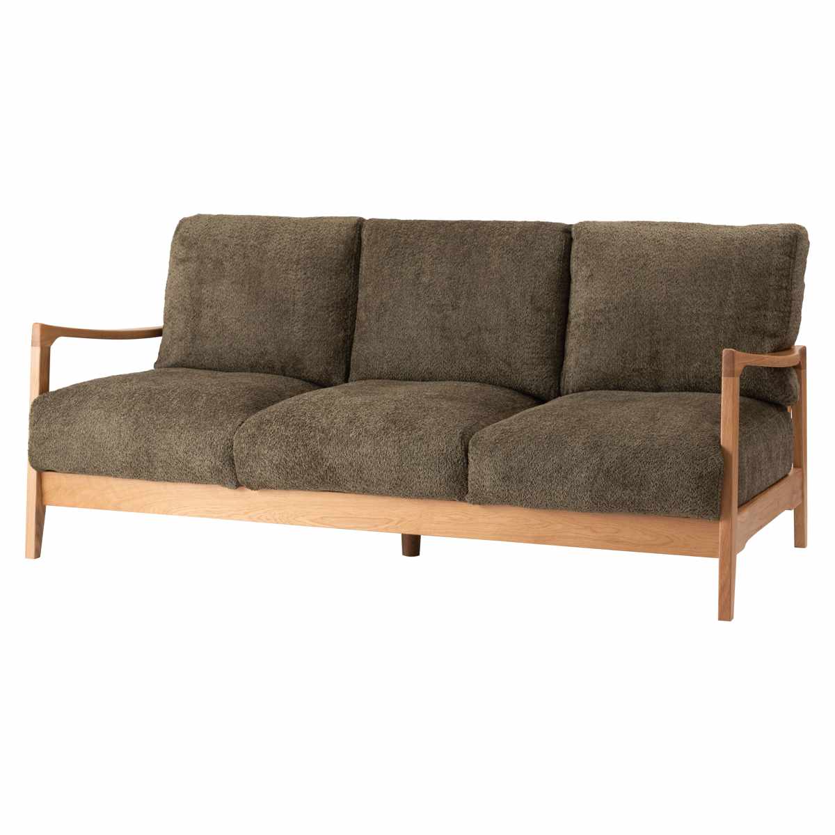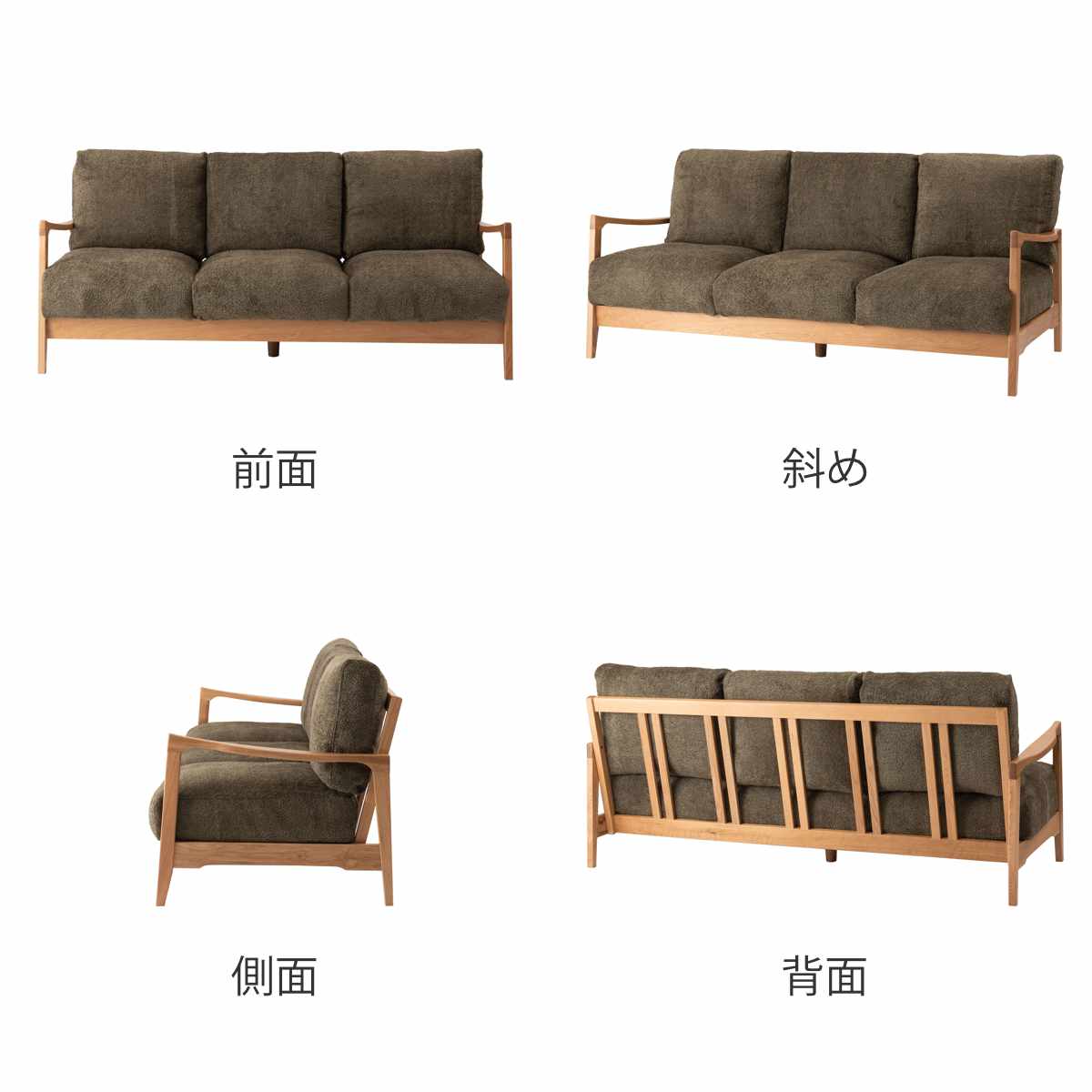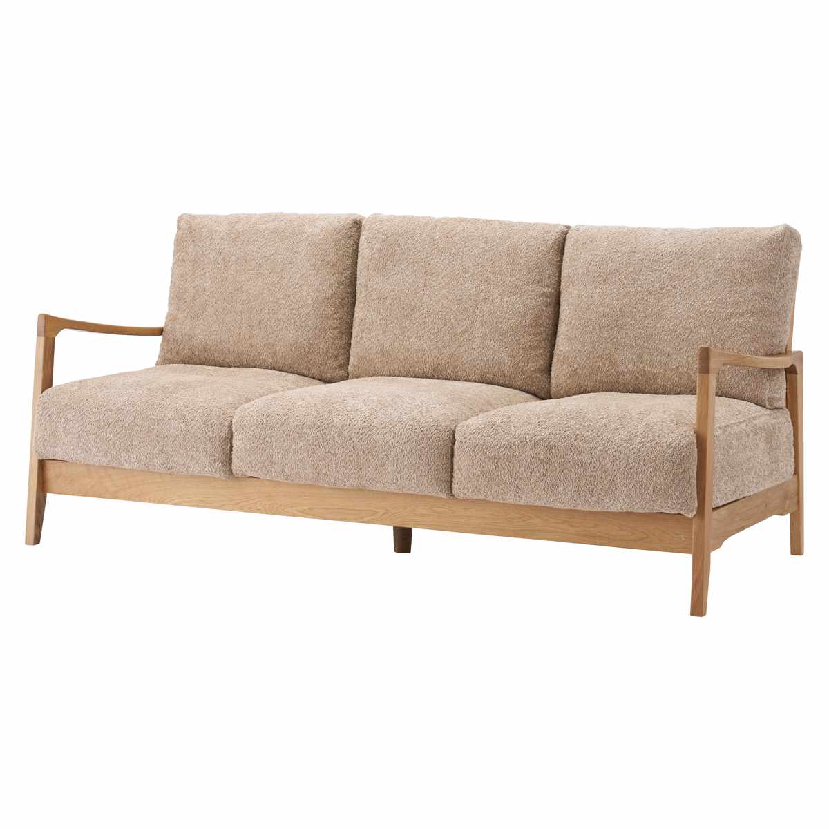 天然木オークのフレームと、ほっこりとしたブークレ生地のクッションが柔らかな印象のソファです。背面・座面ともにボリューム感のある設計で、クッション性も抜群。ゆったりとおくつろぎいただけます。