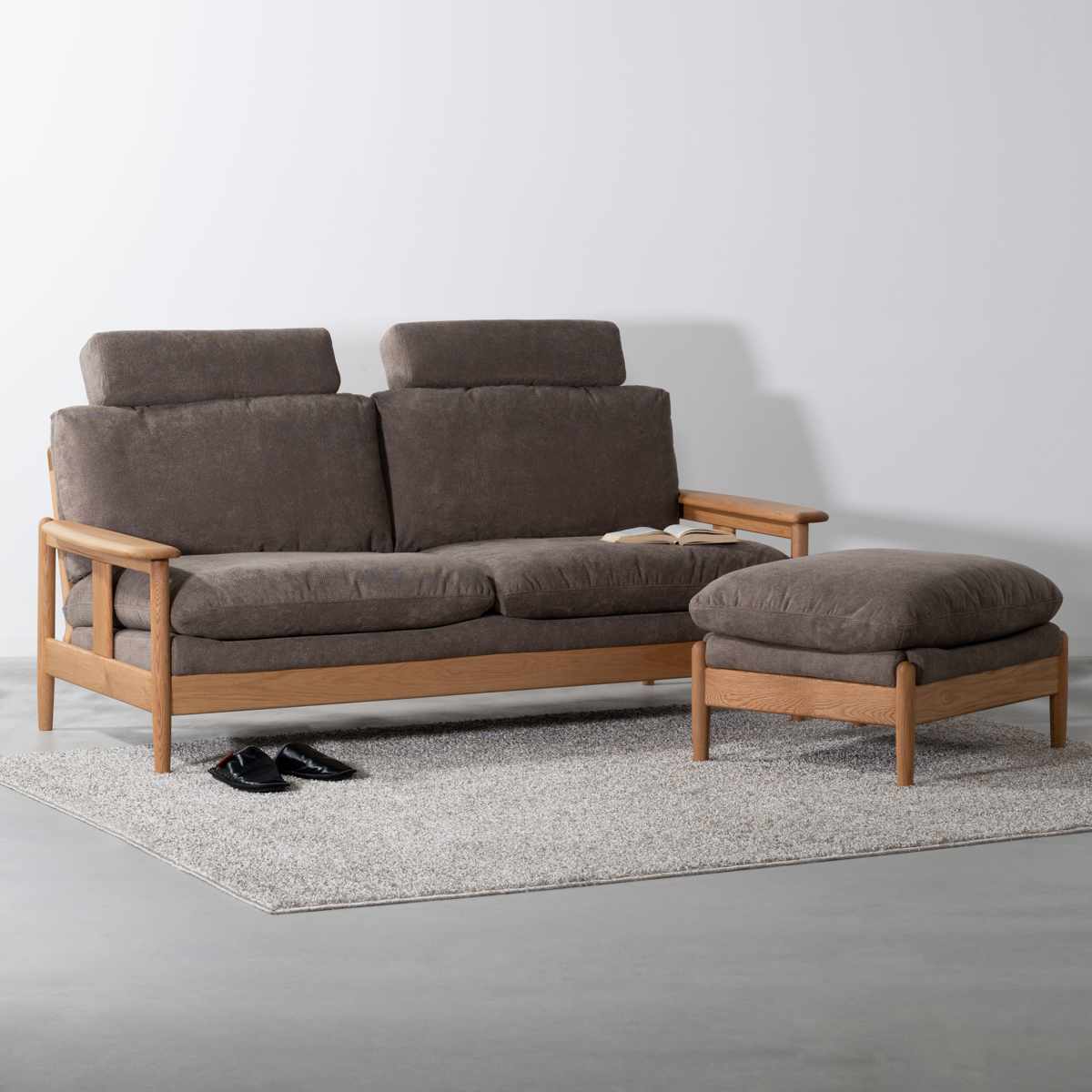 天然木のフレームとやわらかなクッションが調和した、ナチュラルデザインのソファです。ヘッドレスト付きで首までしっかり支え、広々とした座面でゆったりとくつろげます。幅180cmの3人掛けサイズで、ご家族や来客時にも快適にご使用いただけます。