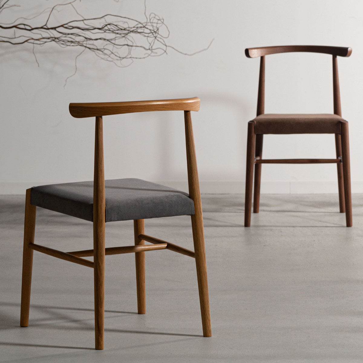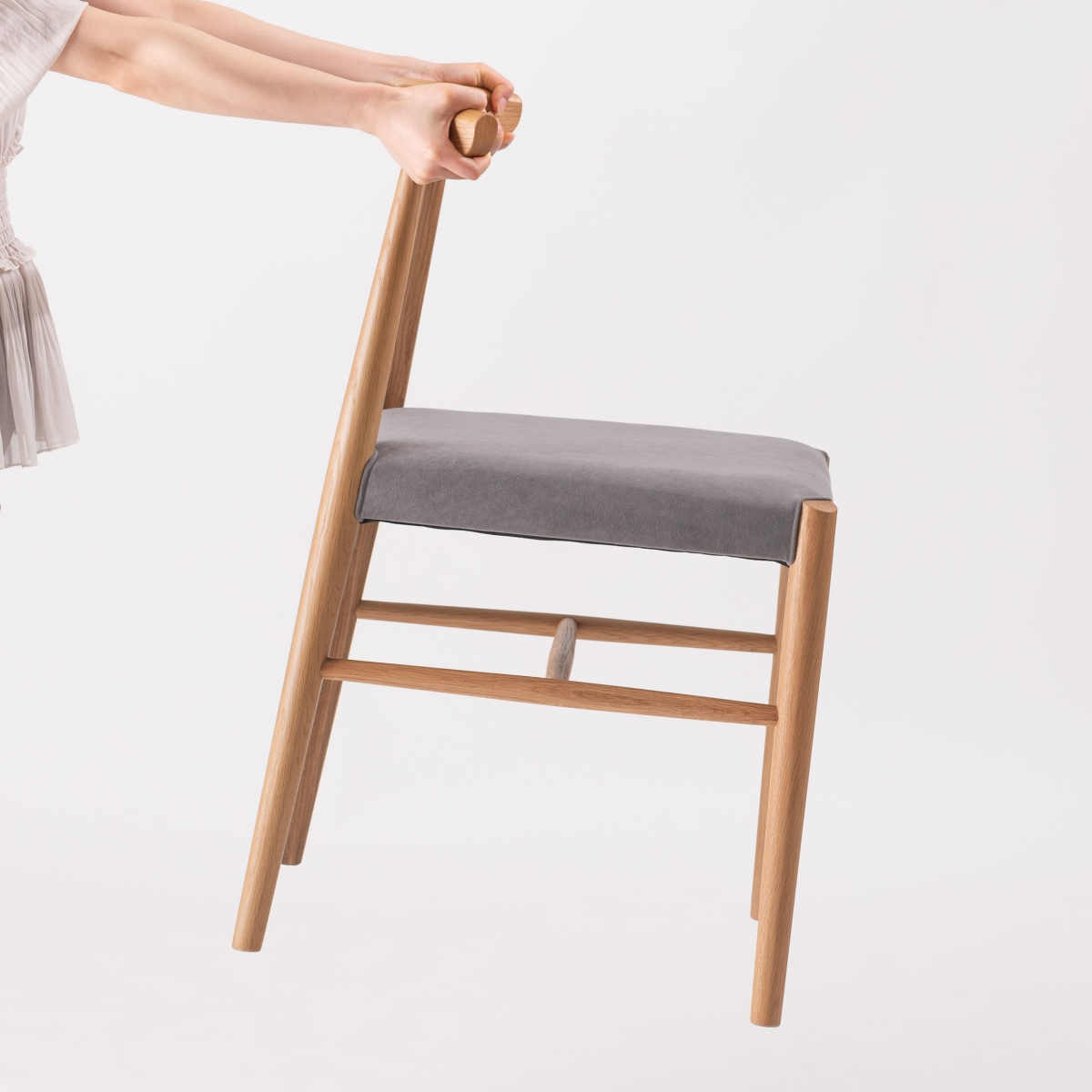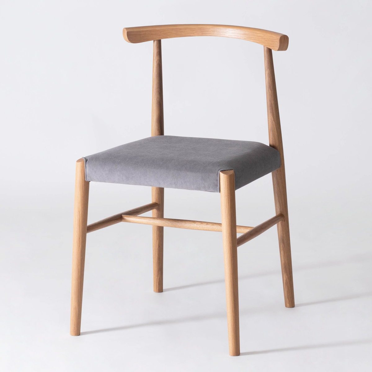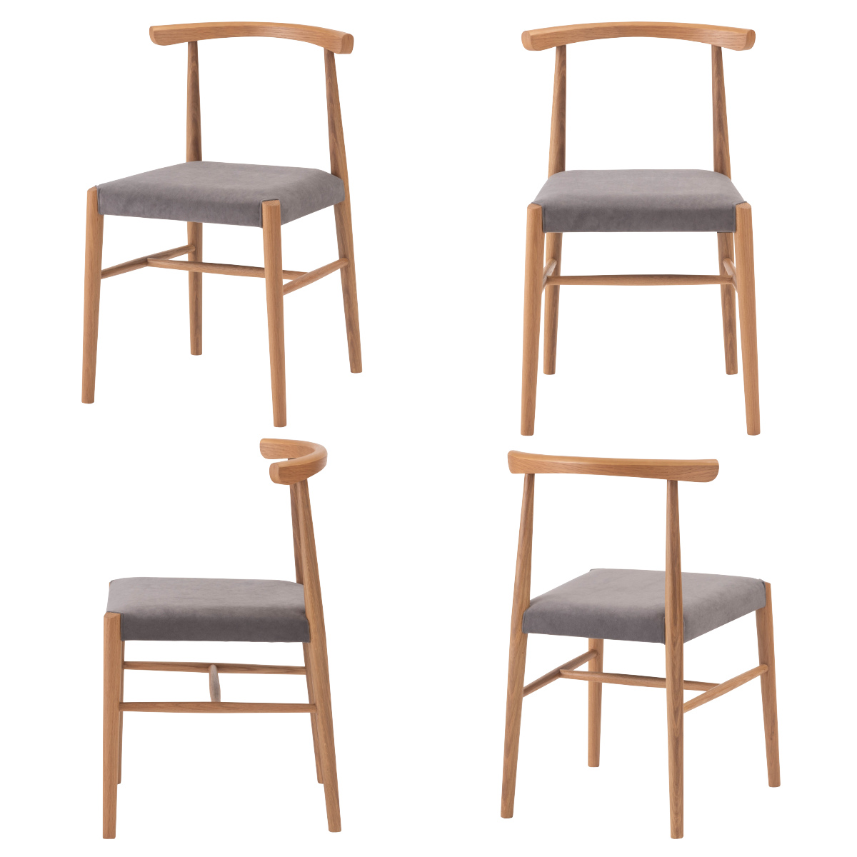オーク材の美しさに調和する座面生地を採用したダイニングチェアです。天然木のやさしい雰囲気をそのまま楽しめるシンプルなフレームは、飽きがこず、長くお使いいただけます。