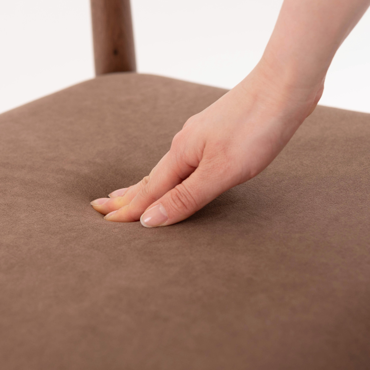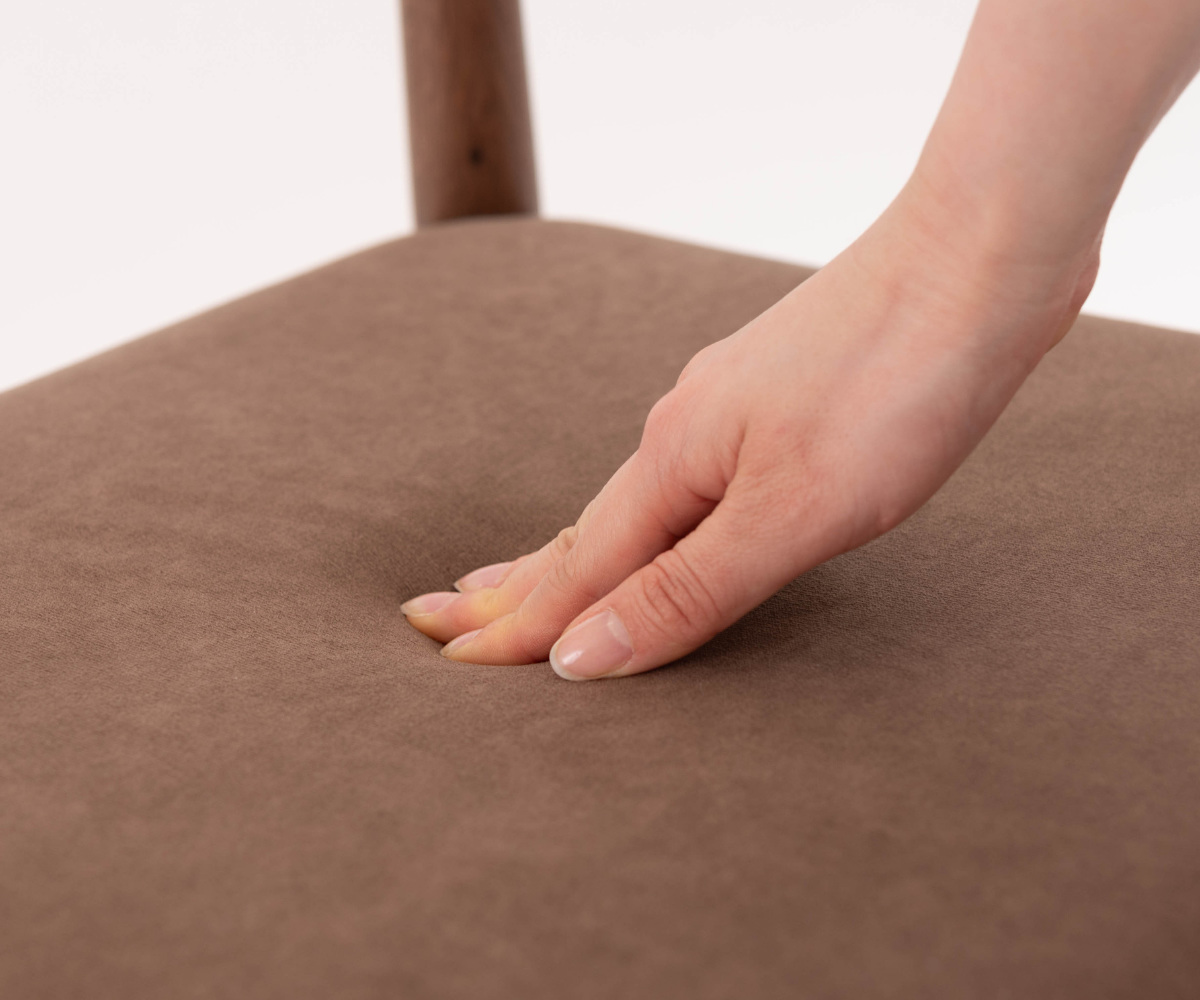 座面はほどよいクッション性があり、長時間の食事や団らんのひとときも心地よく過ごせます。また、前脚の座面角部分は、脚を斜めにカットすることで膝裏へのあたりを軽減します。