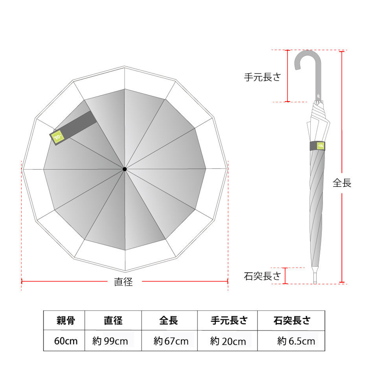 | サイズ | 【12本骨タイプ】 親骨の長さ:約60cm 全長:約87cm 直径:約99cm 持ち手の長さ:約20cm 持ち手の太さ:約2cm 石突の長さ:約6.5cm |