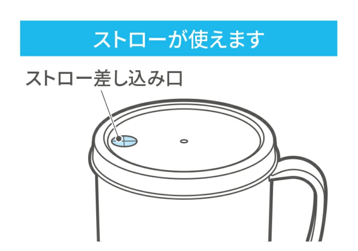 フタには市販のストローが差し込める差し込み口が付いています。ストローを使えば、傾けずに飲むことができるので、作業中や療養中の際に役立ちます。