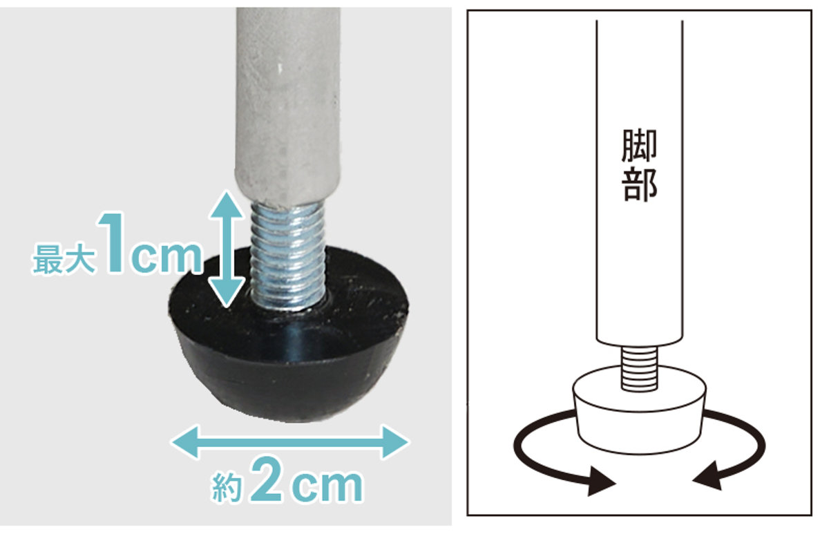 脚部はアジャスター付きで、床の傾きや凸凹によるガタツキを軽減することができます。フラットタイプの防水パンをまたぐことができるので、設置場所を選びません。
