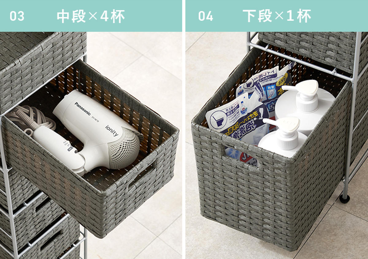取り出しやすい中段には、使用頻度の高いドライヤーなどを。深さのある下段には洗剤やシャンプーなどのストックを収納しておけます。