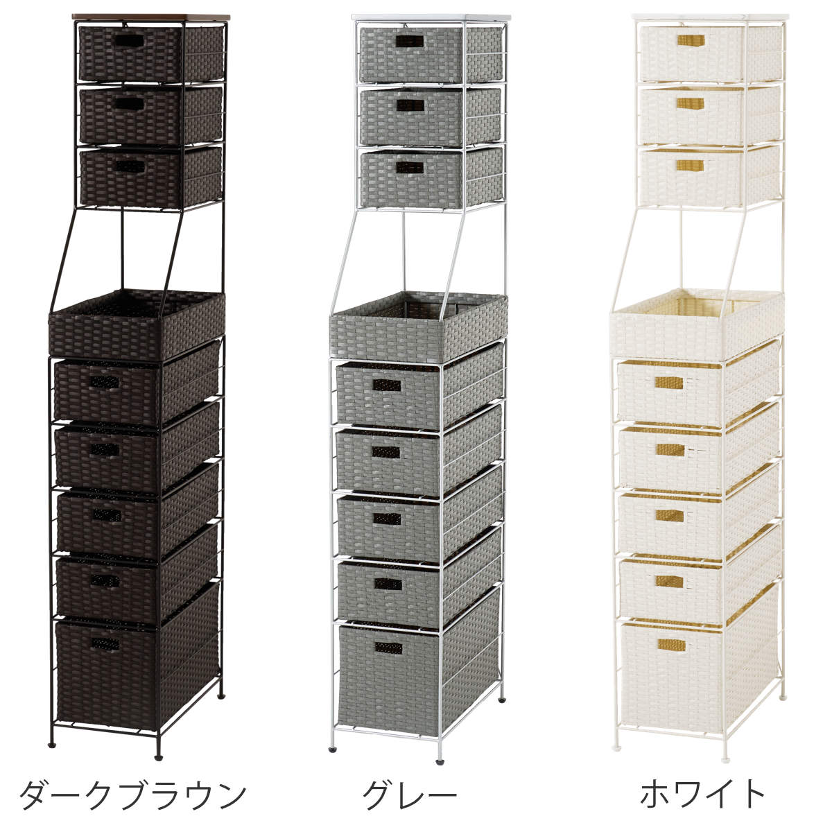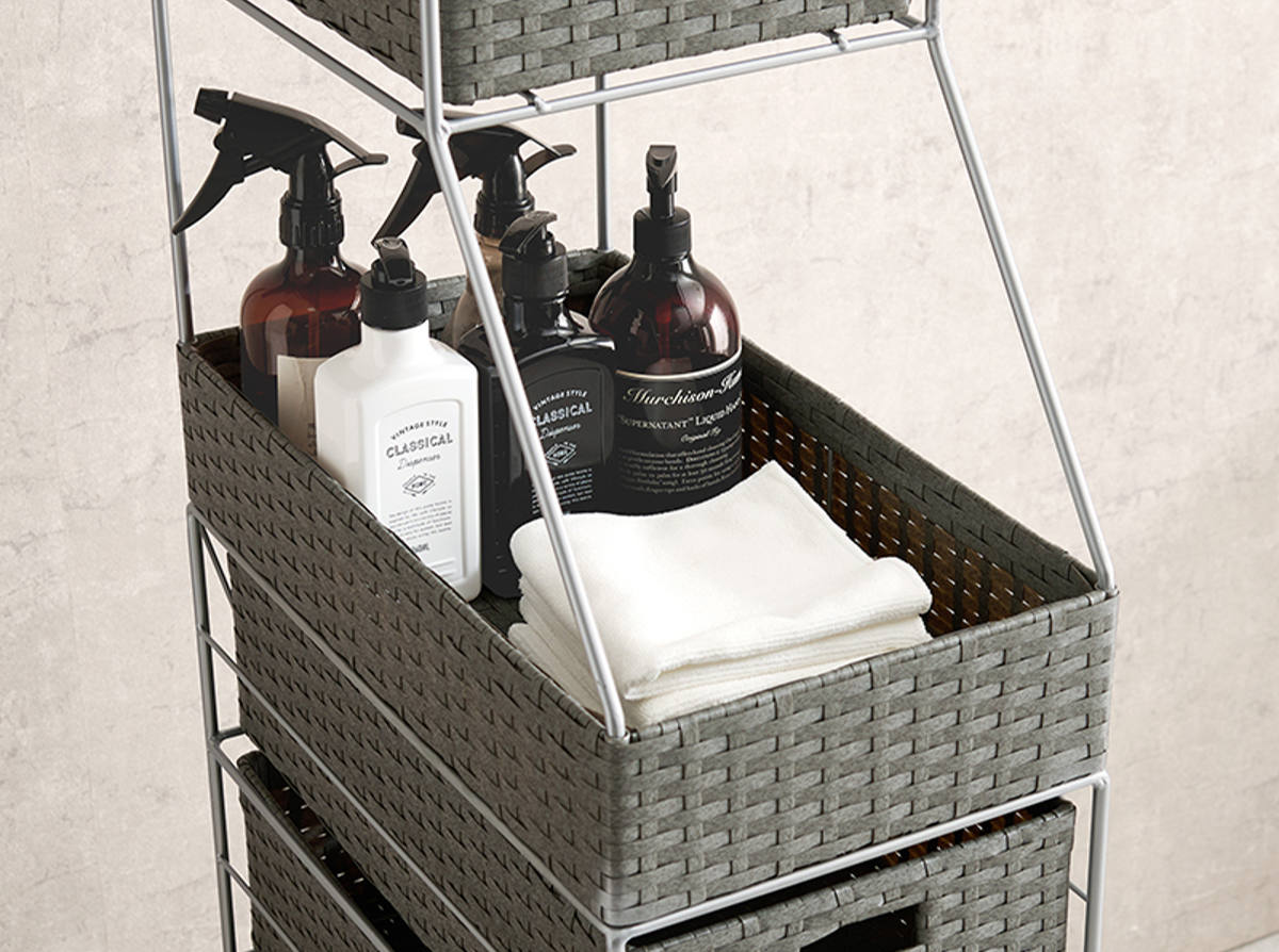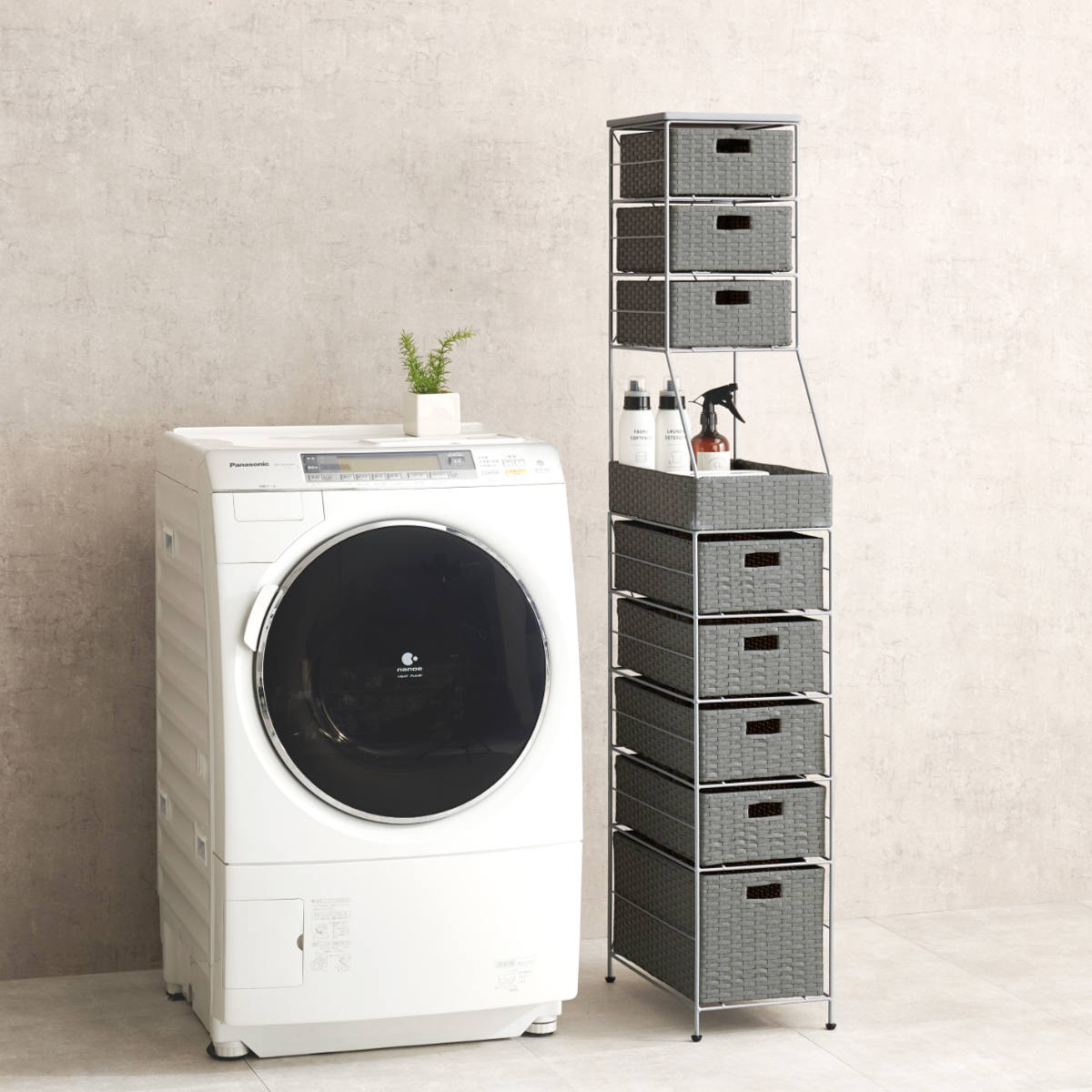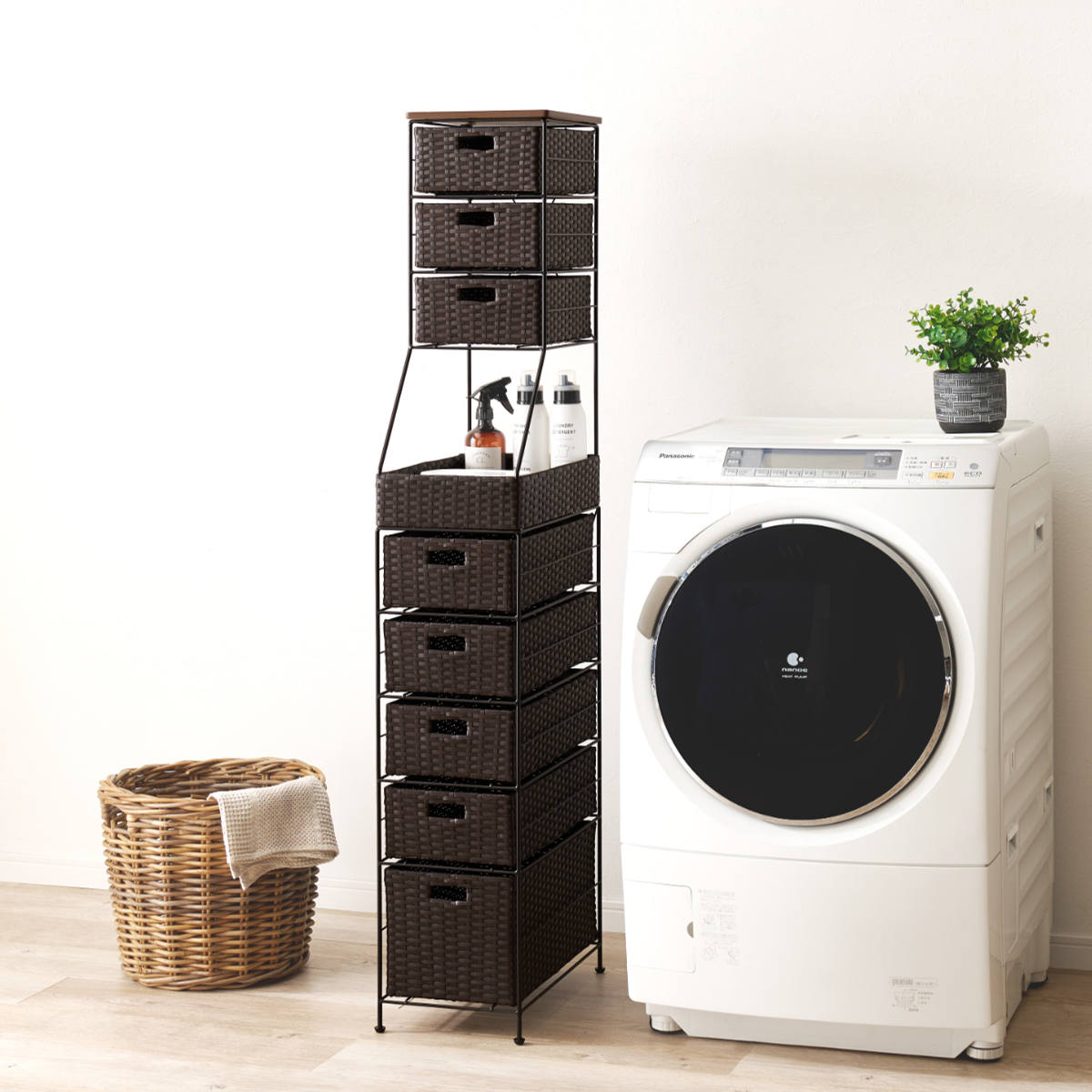 洗面所や脱衣所のちょっとした隙間に収まるランドリーチェストです。幅25cmのスリムなサイズ感ですが、豊富な収納スペースでしっかりと片付けられます。生活感が出てしまいやすいランドリールームも、ラタン調のバスケットで美しく爽やかな空間に。