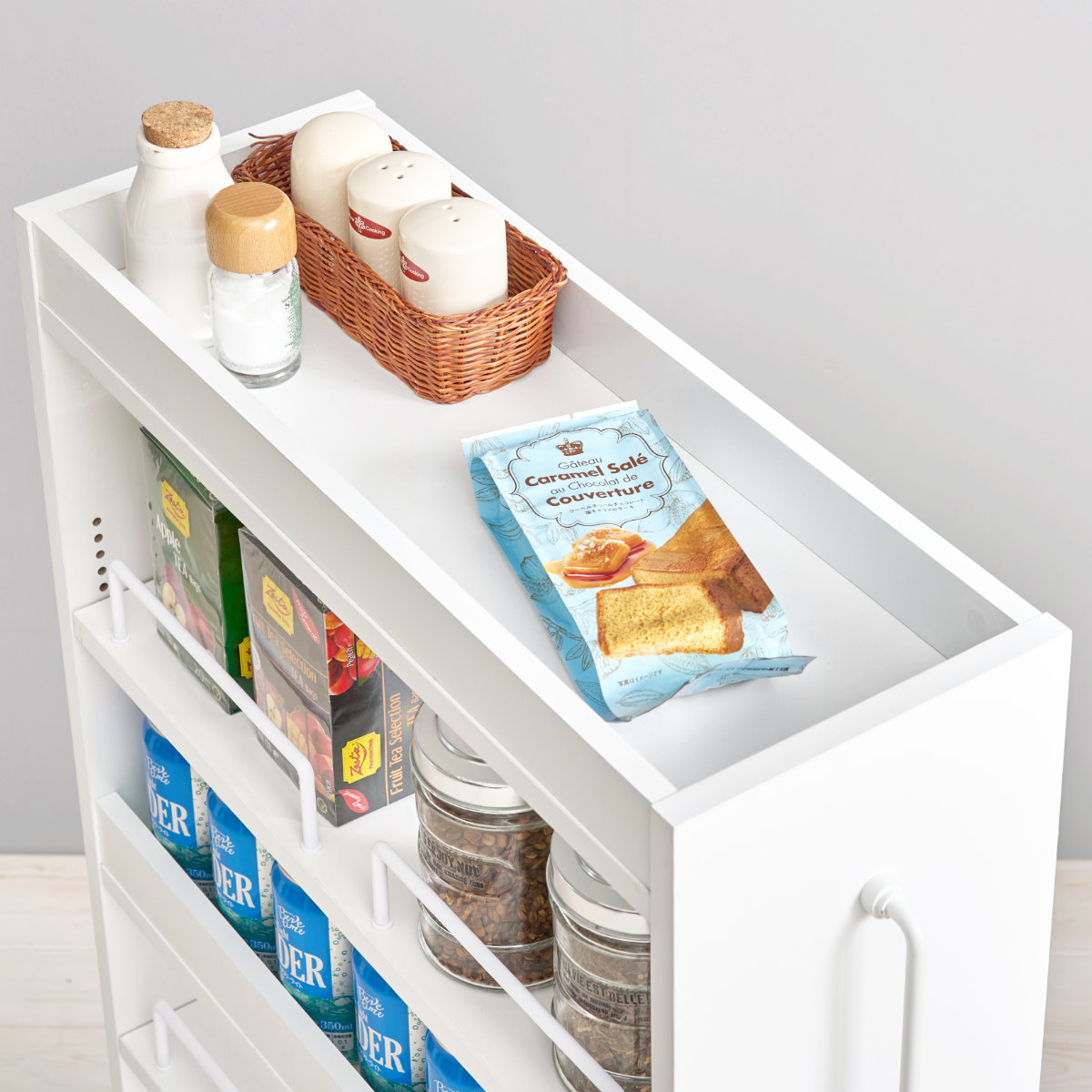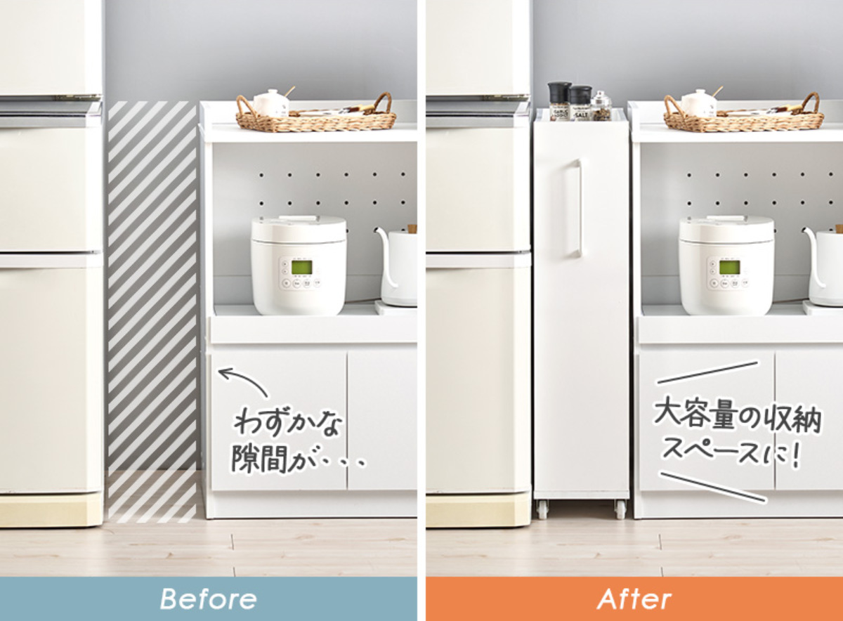「キッチンに物があふれていて、もっとスッキリさせたい」「食品のストック場所が足りない」そんなお悩みを解消する隙間収納ワゴンです。キャビネットと冷蔵庫の間、シンクと冷蔵庫の間など、今までデッドスペースだった隙間を有効活用でき、ごちゃつく小物や食品ストックをスッキリと収納します。