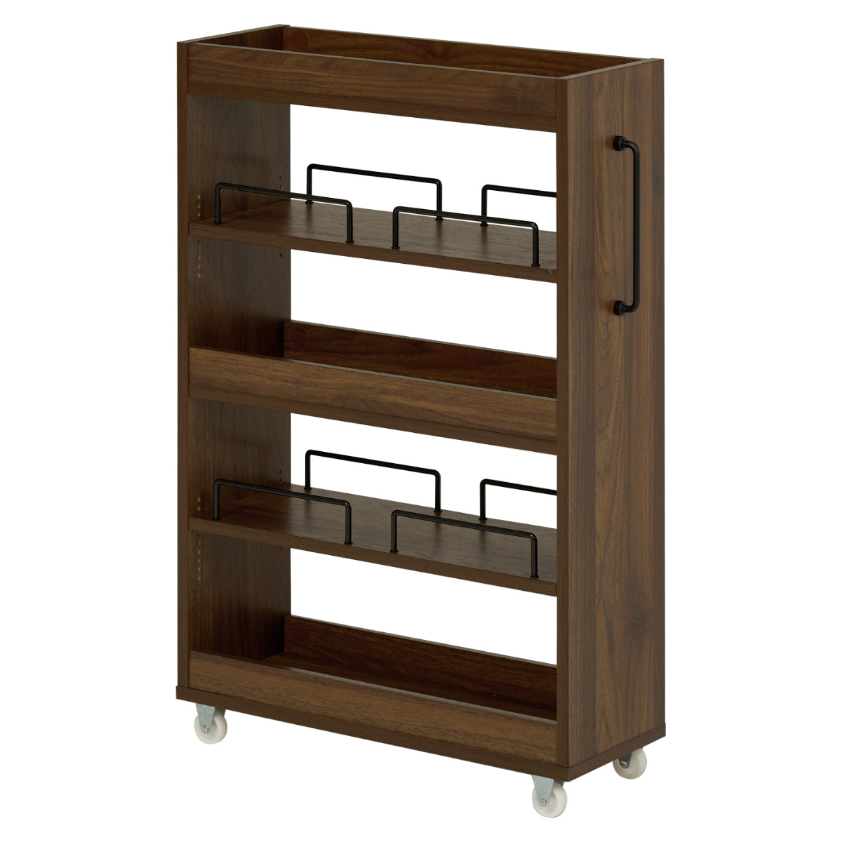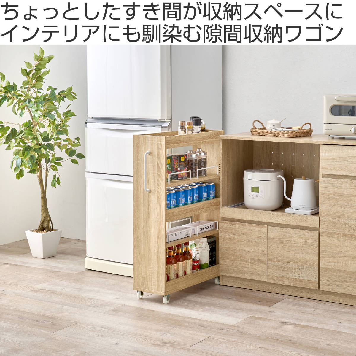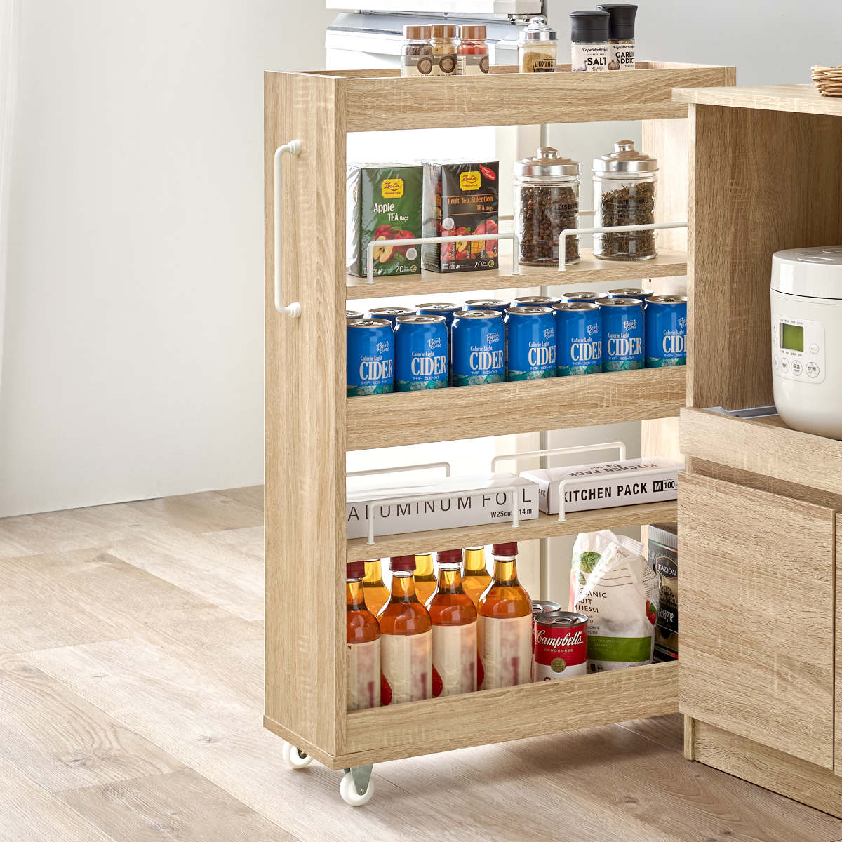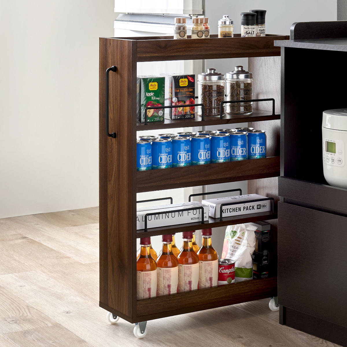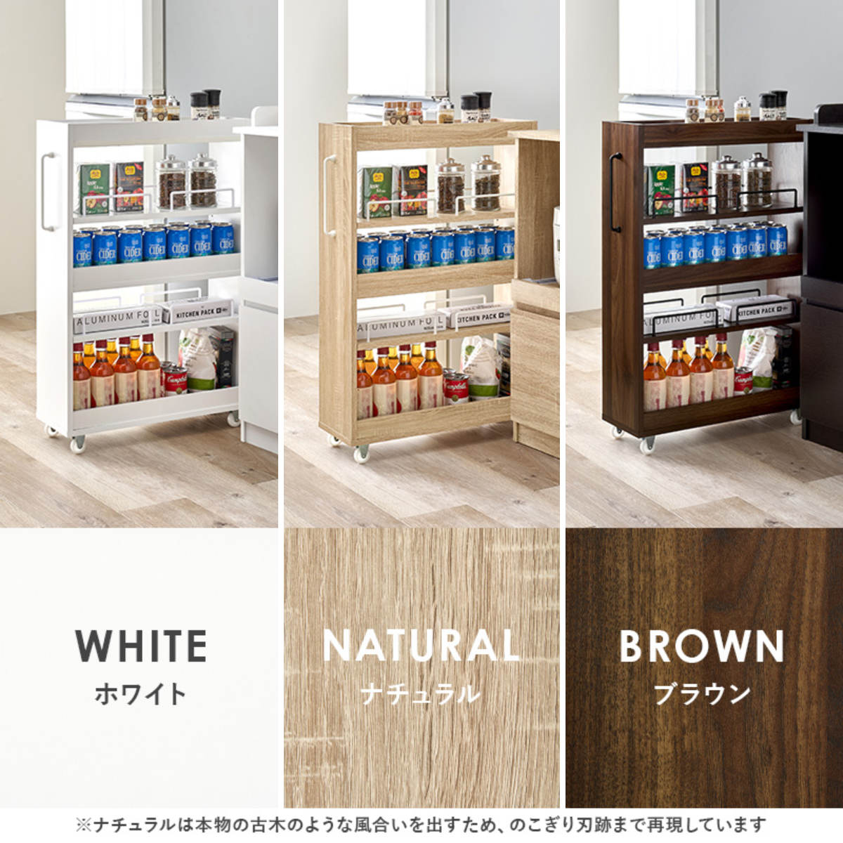 隙間収納ワゴンには珍しいプリント紙化粧パーティクルボード製で、木目調のものもあります。キャビネットやシンク扉の色に合わせるとキッチンのインテリアにも自然と溶け込み、生活感を感じさせません。