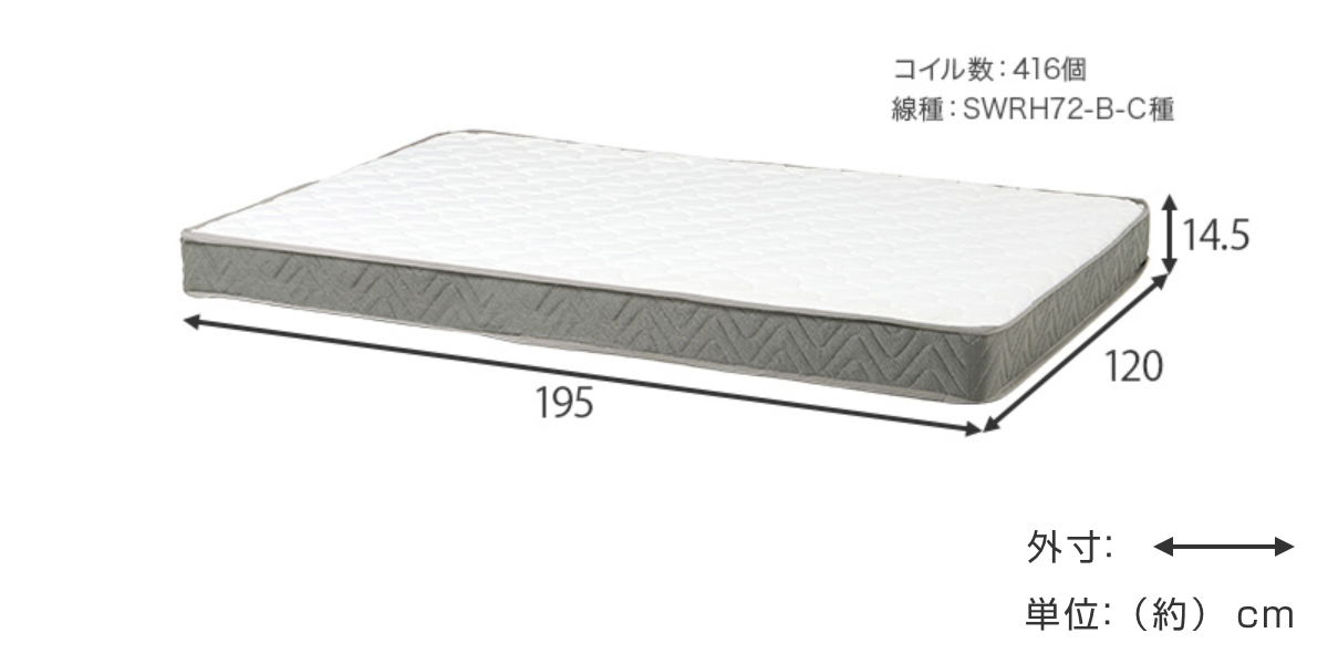 | サイズ | ベッド:約 幅124×奥行210×高さ78(cm) マットレス:約 幅120×奥行195×高14.5(cm) |