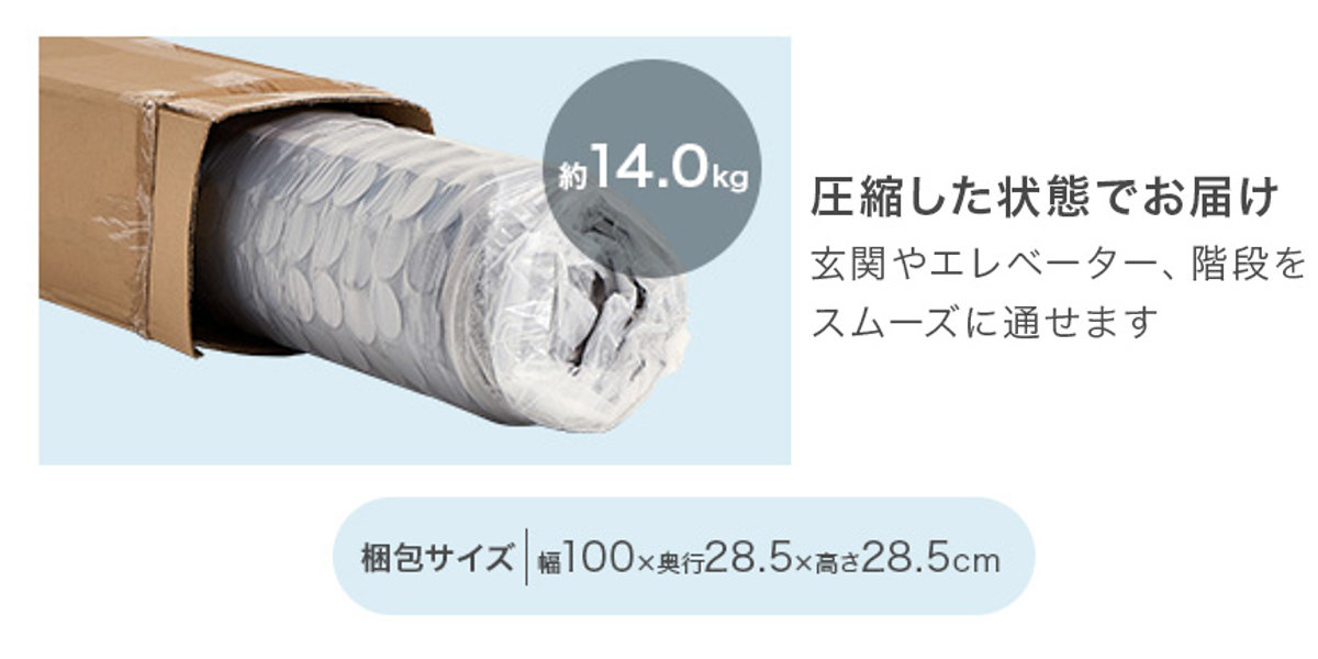 マットレスはコンパクトに圧縮されたロール状梱包でお届けします。開封するとマットレスが膨らみ、その日からお使いいただけます。
