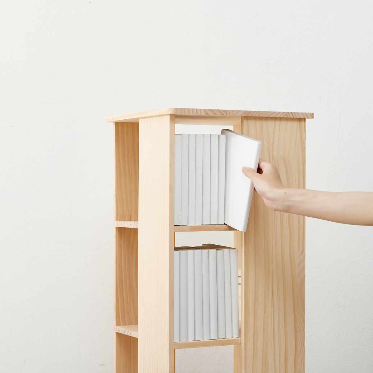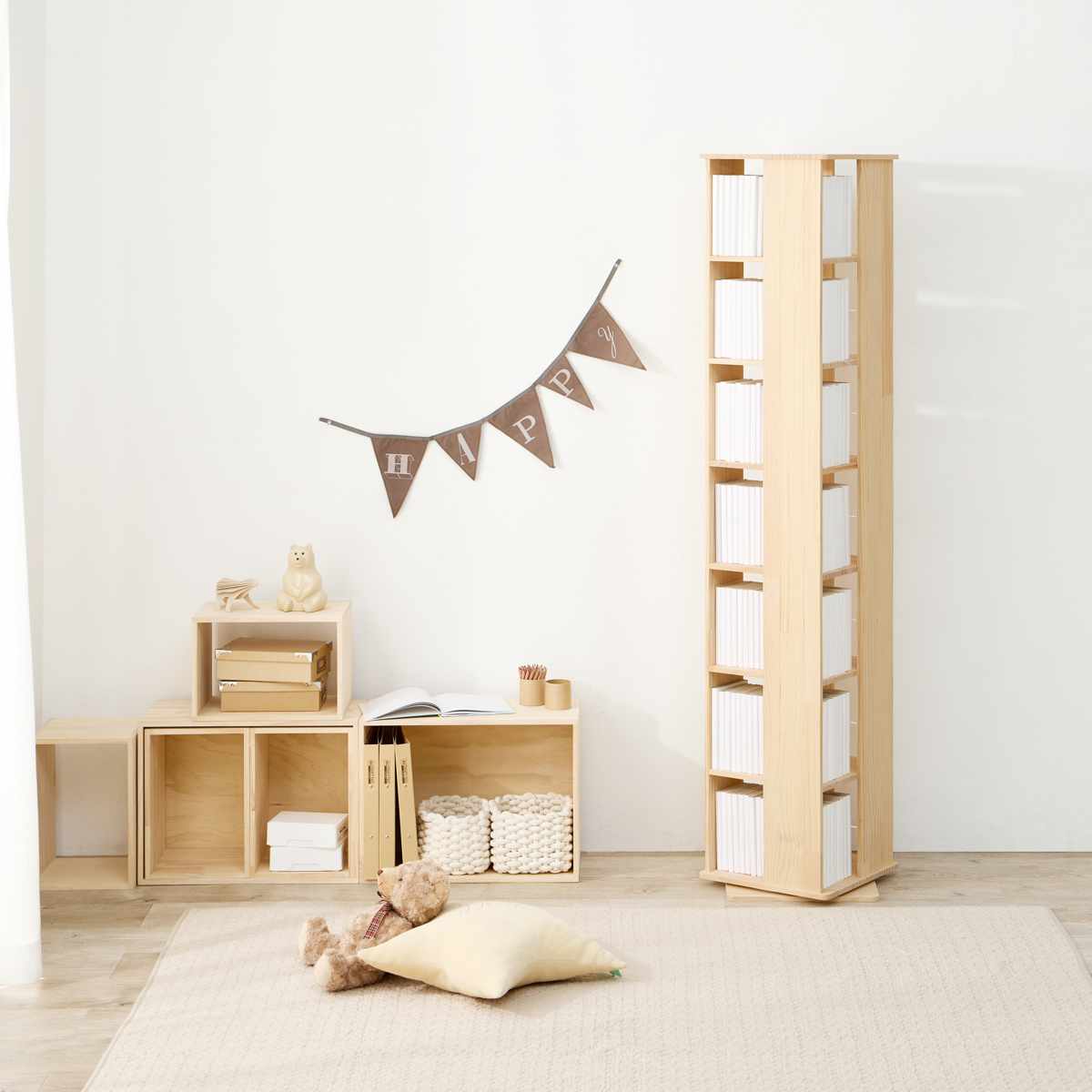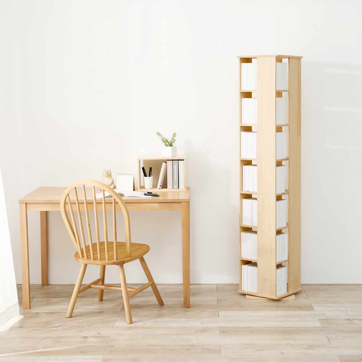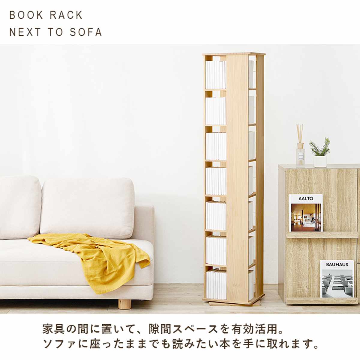 360度回転する、機能的で便利な本棚です。本棚がくるくると回転するので、読みたい本を見つけやすく、楽しく選ぶことができます。インテリアとしてもおしゃれなデザインで、天然木の自然な素材感が温かみのあるお部屋を演出してくれます。