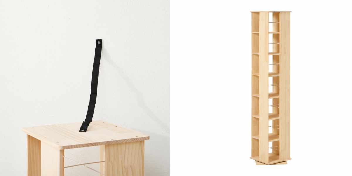 高さのあるラックなので、壁に固定して転倒を防げるひもが付いています。