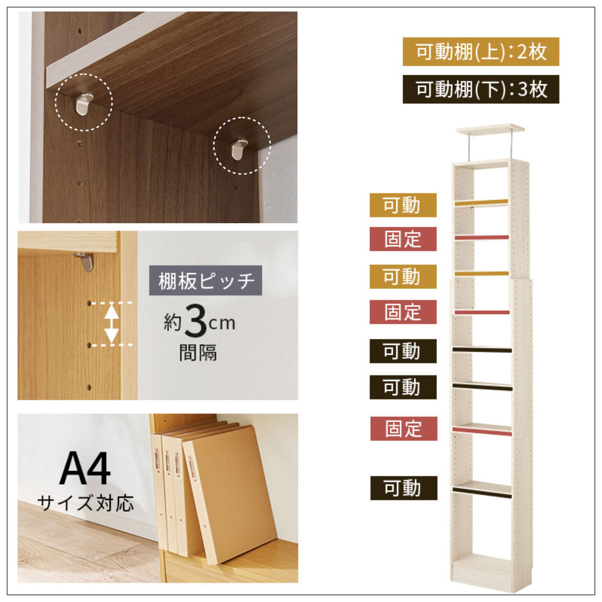 棚板の高さは3cmピッチで調節ができます。収納したい物の高さに合わせて細かく調節ができてスペースが無駄になりません。A4サイズに対応しているので、教科書や書類の整理にもぴったり。