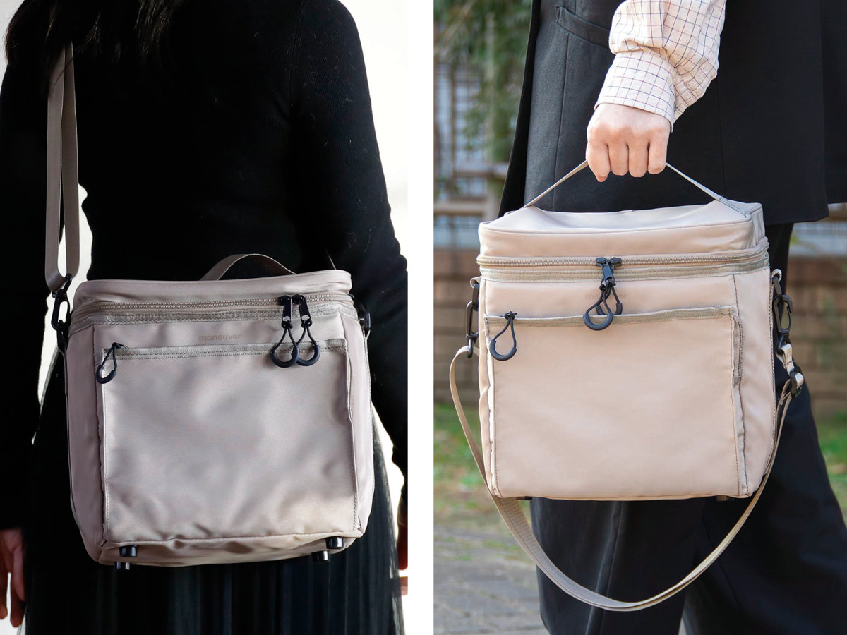ショルダーベルト付きで、肩掛けスタイルにも。シーンや中身の重さに合わせて、気軽に持ち方をお選びいただけます。