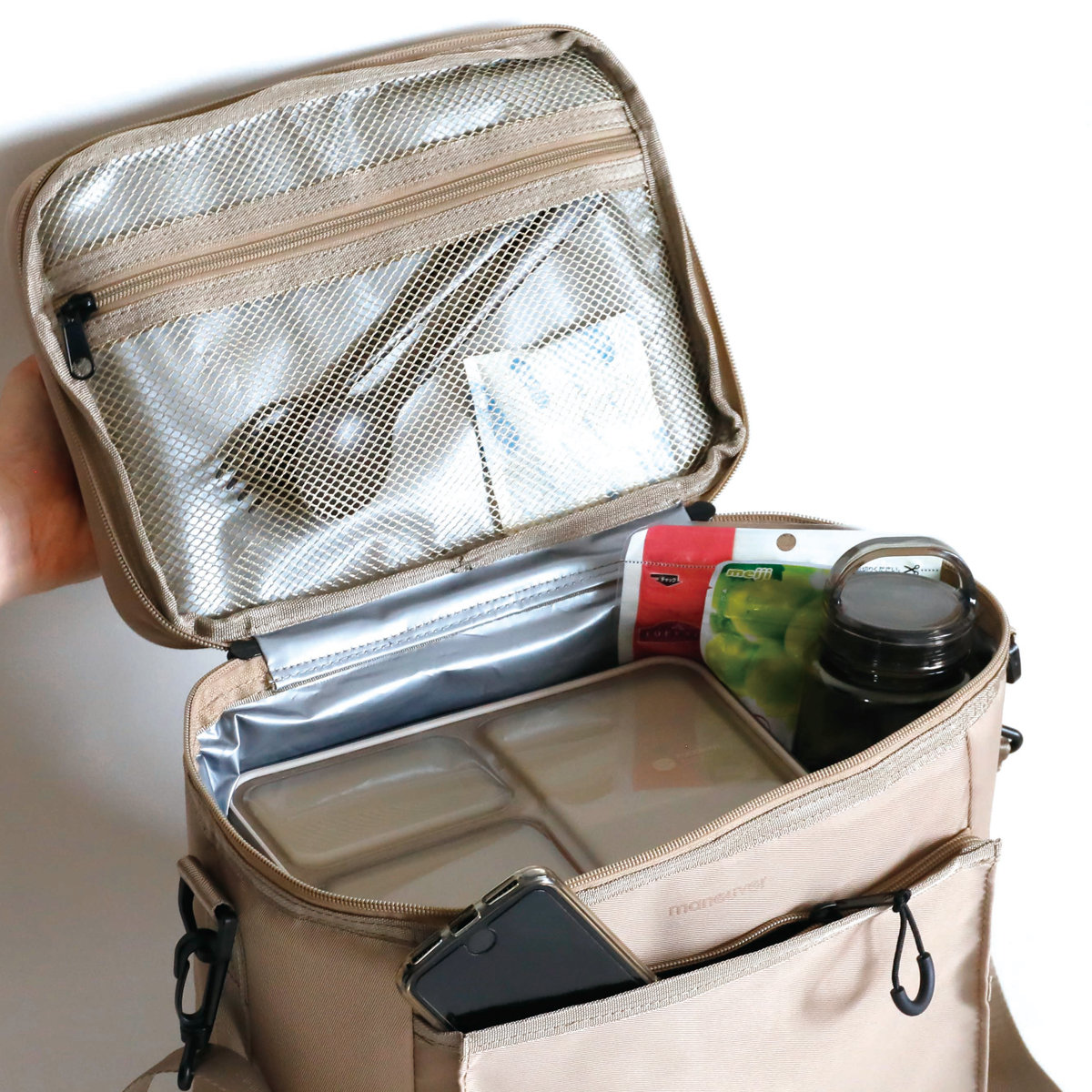 内側にはメッシュタイプのポケットがあり、保冷剤やおしぼり、カトラリーなどを入れておけます。さらに外側にも大きめのポケットが付いており、スマホや小物類を入れられます。