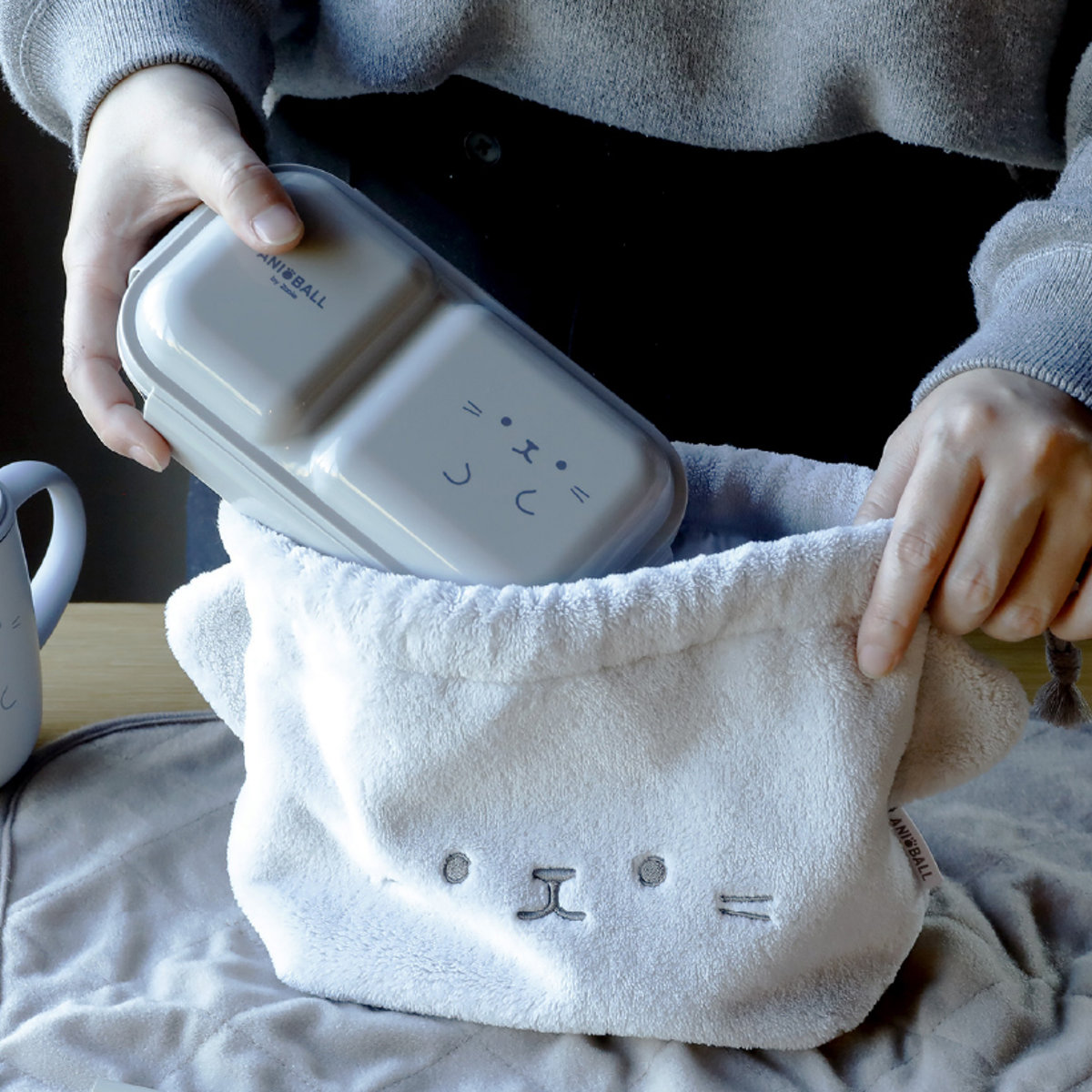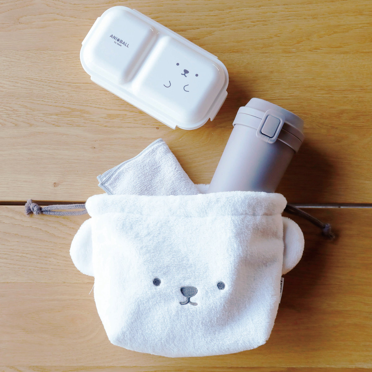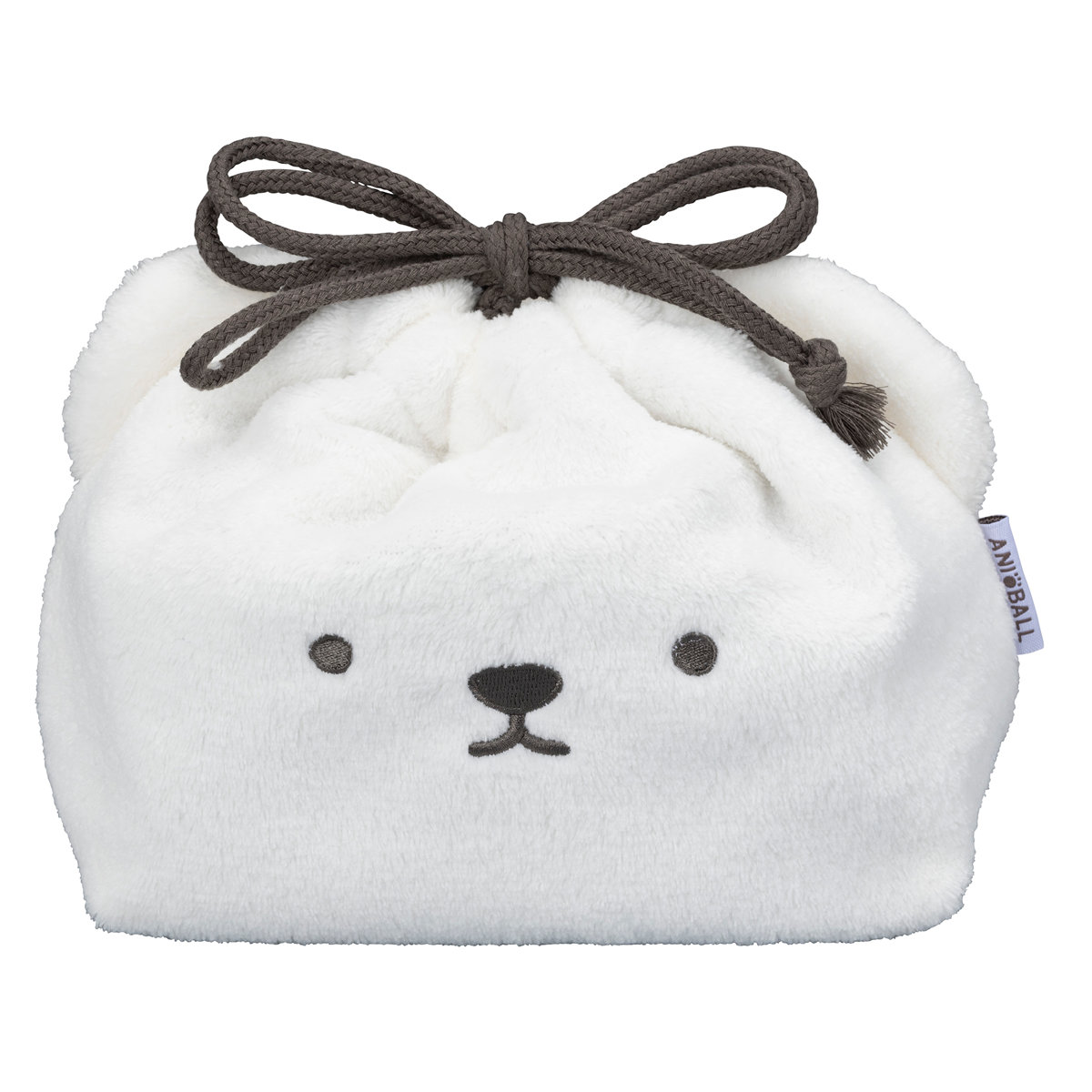 大人も使いたくなるアニマルキャラクターシリーズ 「アニボール」の保冷ランチ巾着です。つい触りたくなる、ふわふわな触り心地が魅力。中にお弁当箱を入れて巾着を絞ると、可愛らしい丸みのあるシルエットになります。