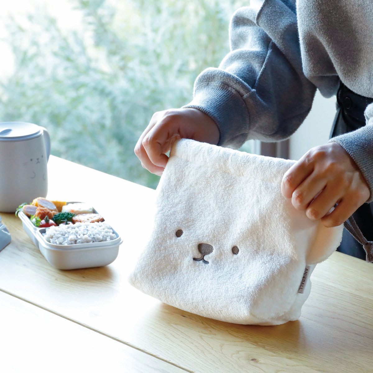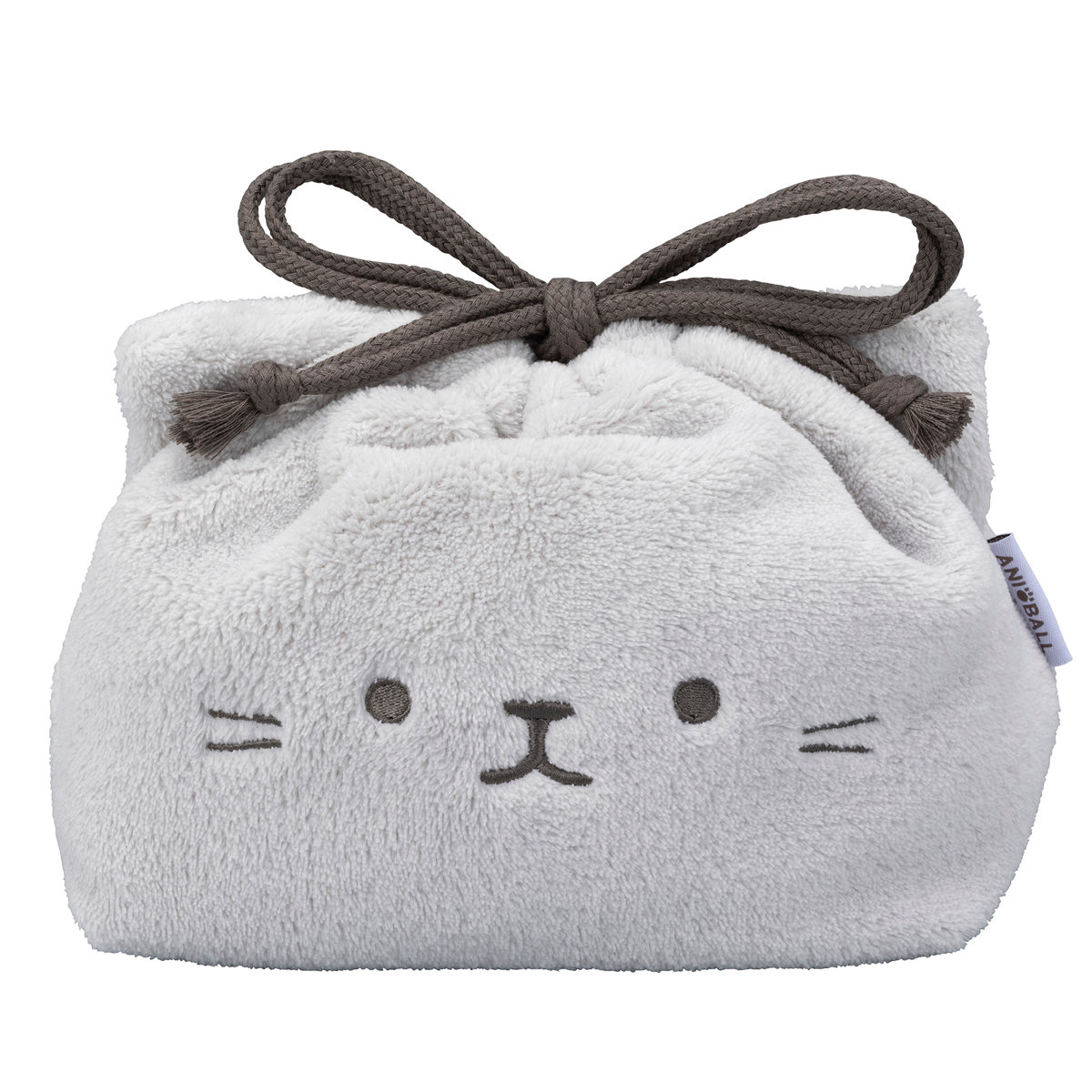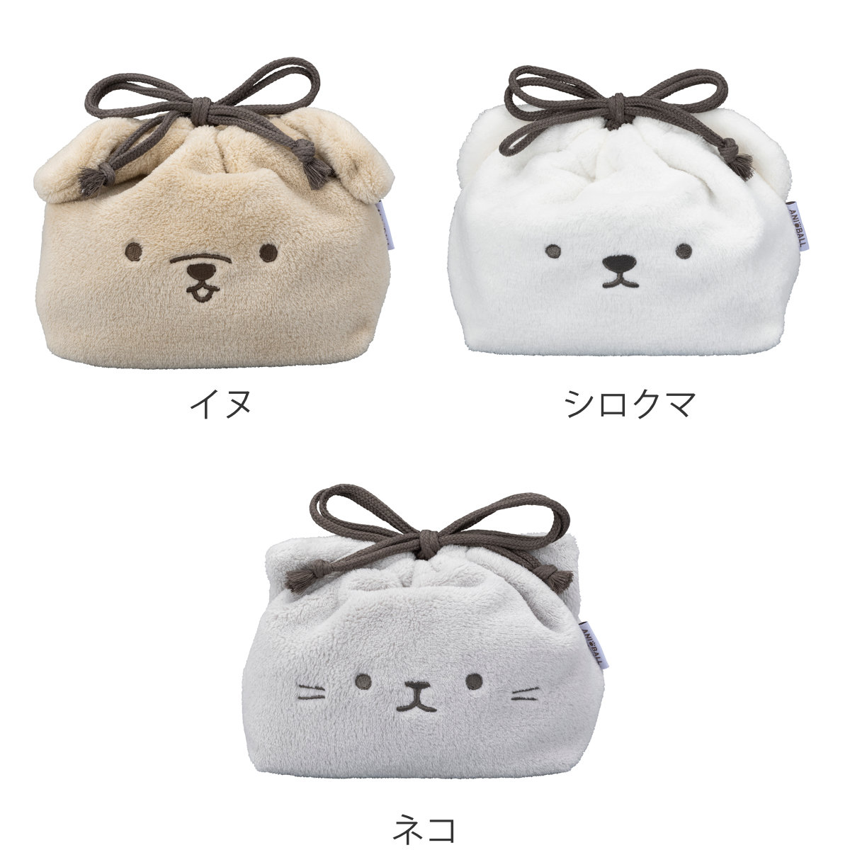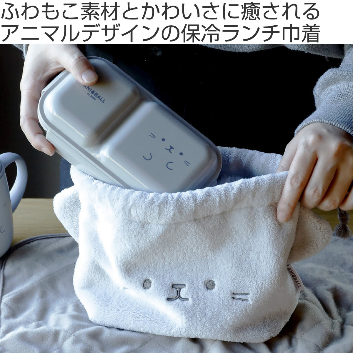大人も使いたくなるアニマルキャラクターシリーズ 「アニボール」の保冷ランチ巾着です。つい触りたくなる、ふわふわな触り心地が魅力。中にお弁当箱を入れて巾着を絞ると、可愛らしい丸みのあるシルエットになります。