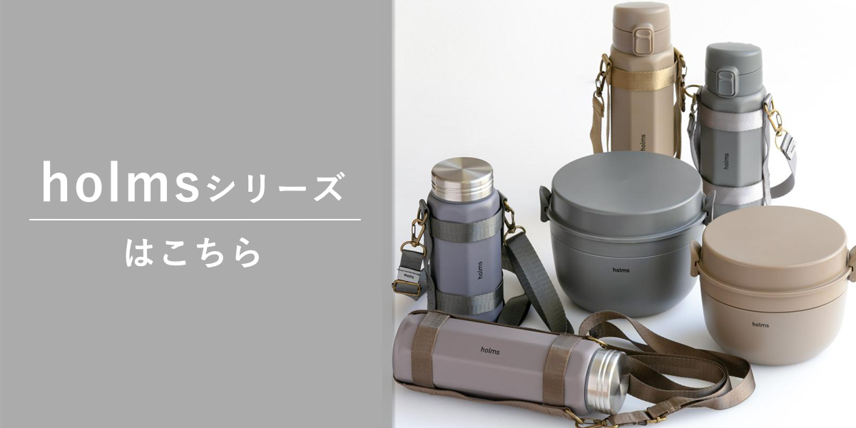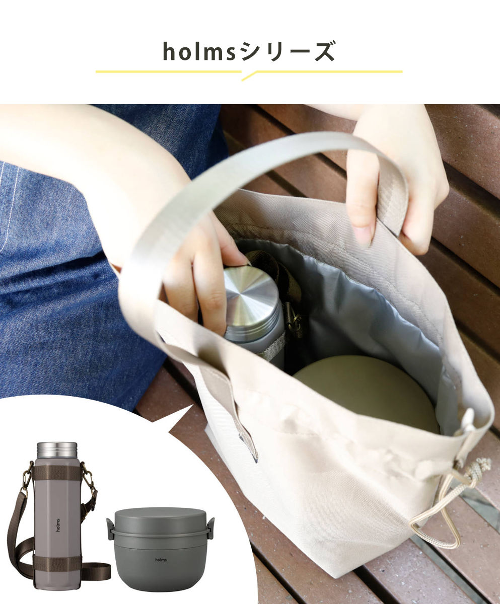 holms(ホルムス)シリーズのランチジャーやボトルをまとめて持ち運ぶのに最適です。かさ張りがちな水筒とお弁当を一つにして運べるのが嬉しいですね。
