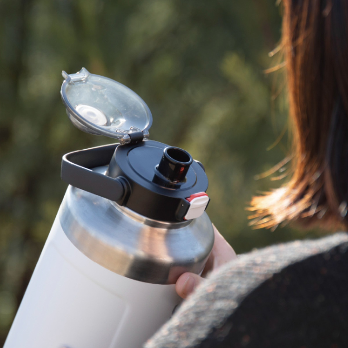 ワンタッチで開く蓋でサッと飲め、使わない時はロックして漏れを防止します。スポーツバッグにそのまま入れても安心です。