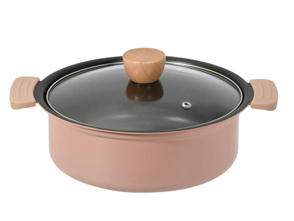 | 材質 | 【本体】 アルミニウム合金(表面加工/内面:ふっ素樹脂塗膜加工 外面:焼付け塗装) はり底:ステンレス鋼(クロム16%) ハンドルカバー:シリコーンゴム 【蓋】 強化ガラス製器具(全面物理強化) 縁リング:ステンレス鋼 つまみ:天然木 【ザル】 ステンレス鋼 |