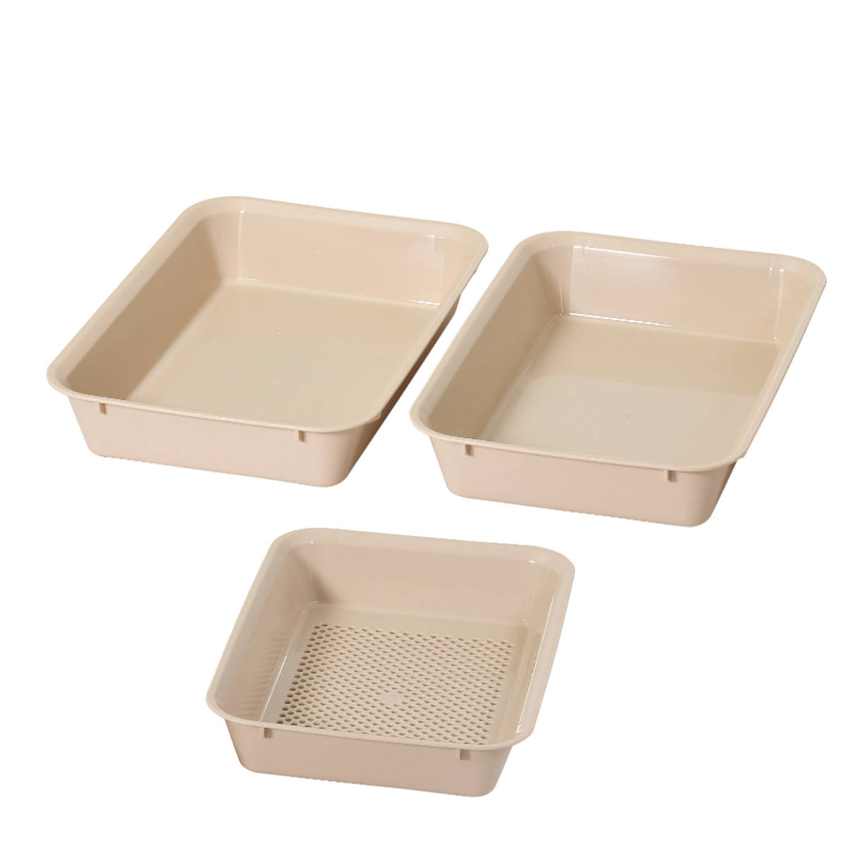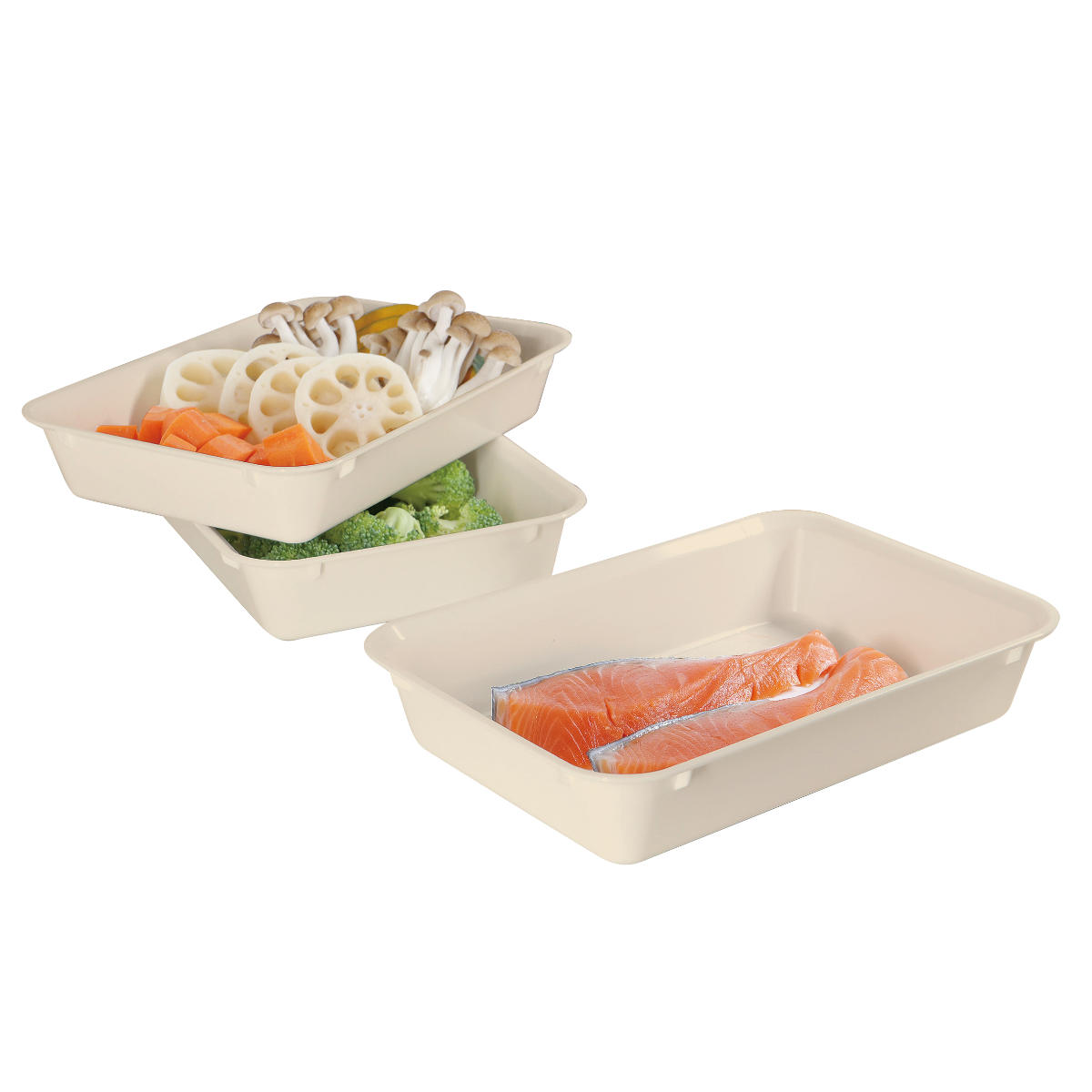 積み重ねできる角型のザル・トレーのセット。切った野菜や下ごしらえした食材をそのまま重ね置きできます。キッチンがスッキリ片付き、作業スペースをしっかり確保できます。