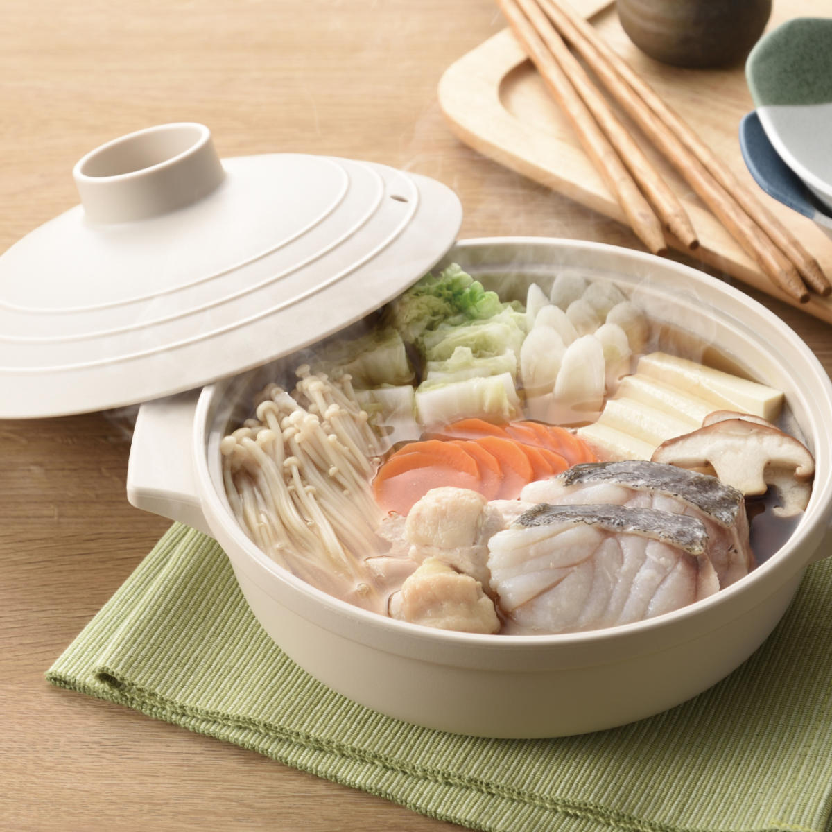 1人分の鍋料理が作れるレンジ調理鍋です。材料を入れてレンジでチンするだけで手軽に調理できます。帰りが遅くなる家族分を取り分けておけば、帰宅後に出来立てのお鍋が楽しめ、そのまま食卓へ運べるので、洗い物もこれ1つ。使い方に困らないレシピ付きです。