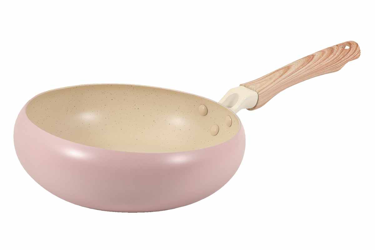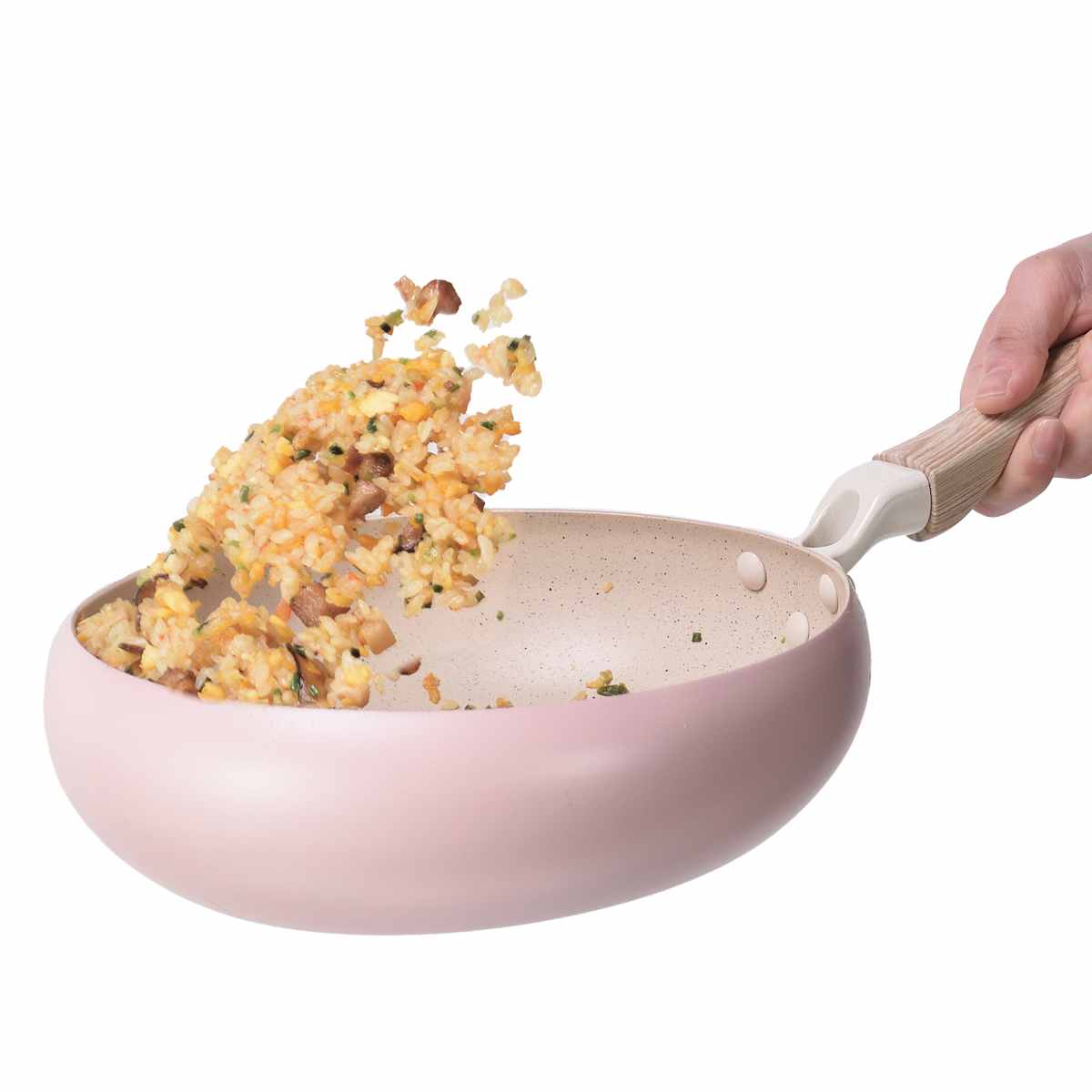 手前と奥で鍋高が異なるフライパンです。あおり調理がしやすいので、炒め物に短時間で均一に火が通り、炒飯はパラパラの仕上がりになります。