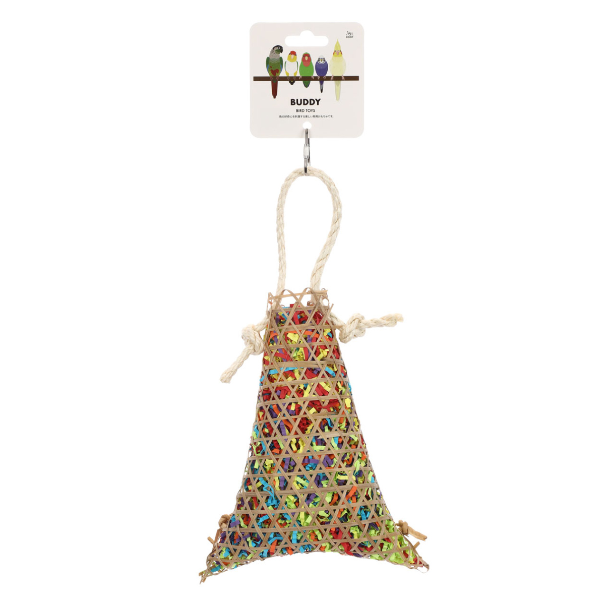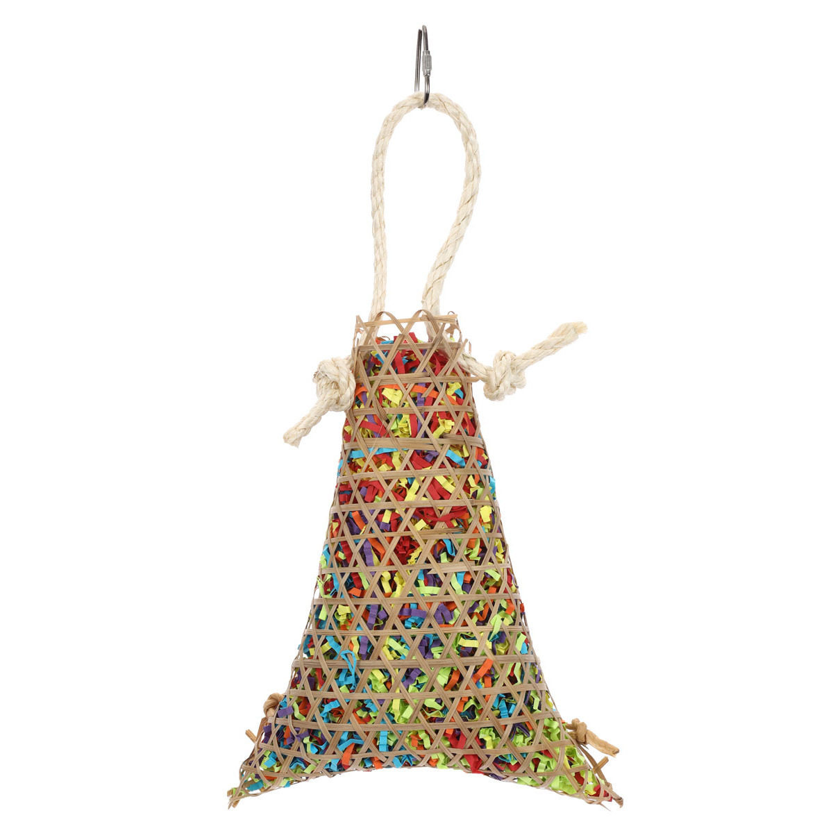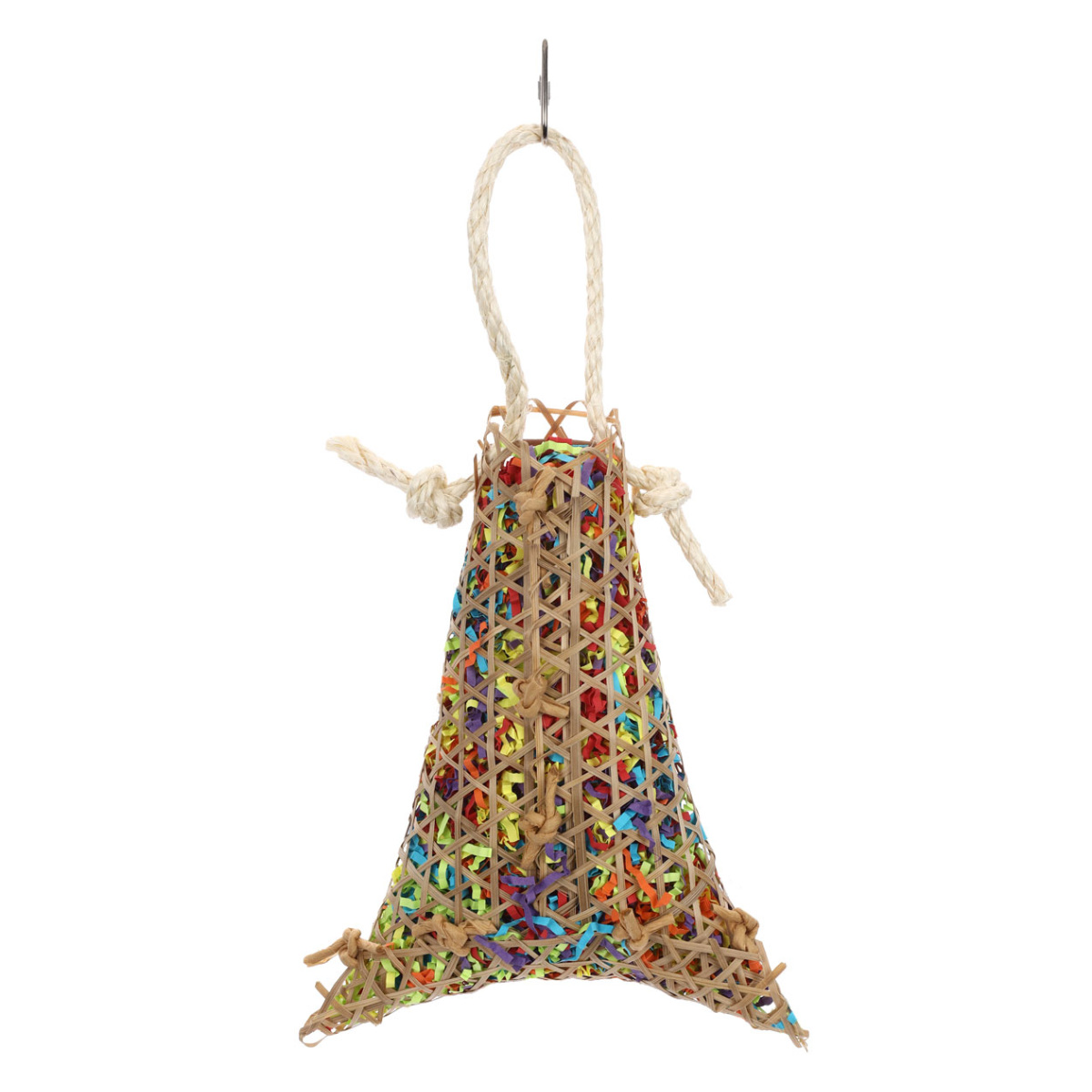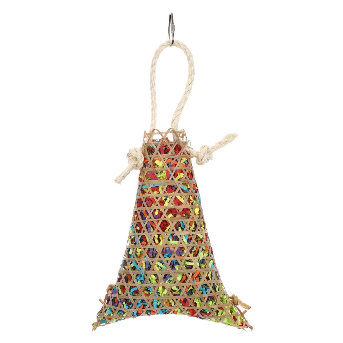 細い竹で編んだかごに、カラフルな短冊状の紙がギッシリ詰まった鳥用おもちゃです。餌や巣材を探したり、虫を突いたりする本能を刺激します。自然素材でできているので、つっついても、噛んでも、かじっても安全です。