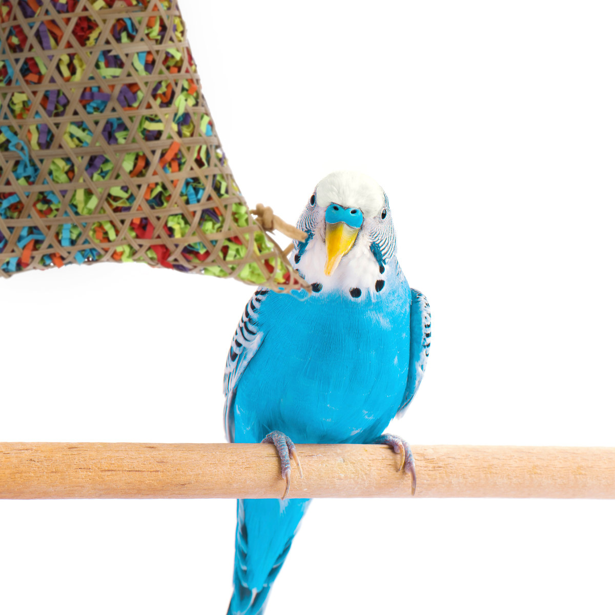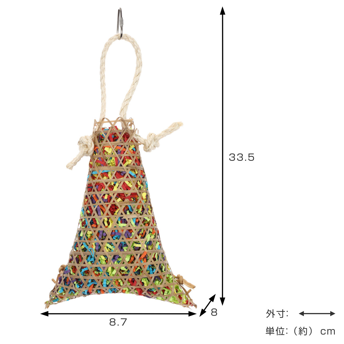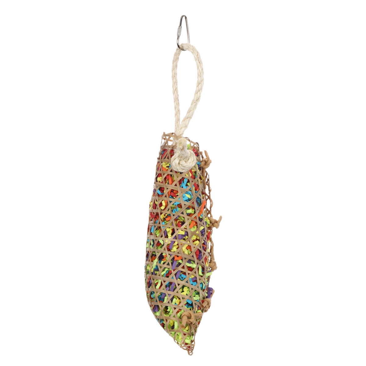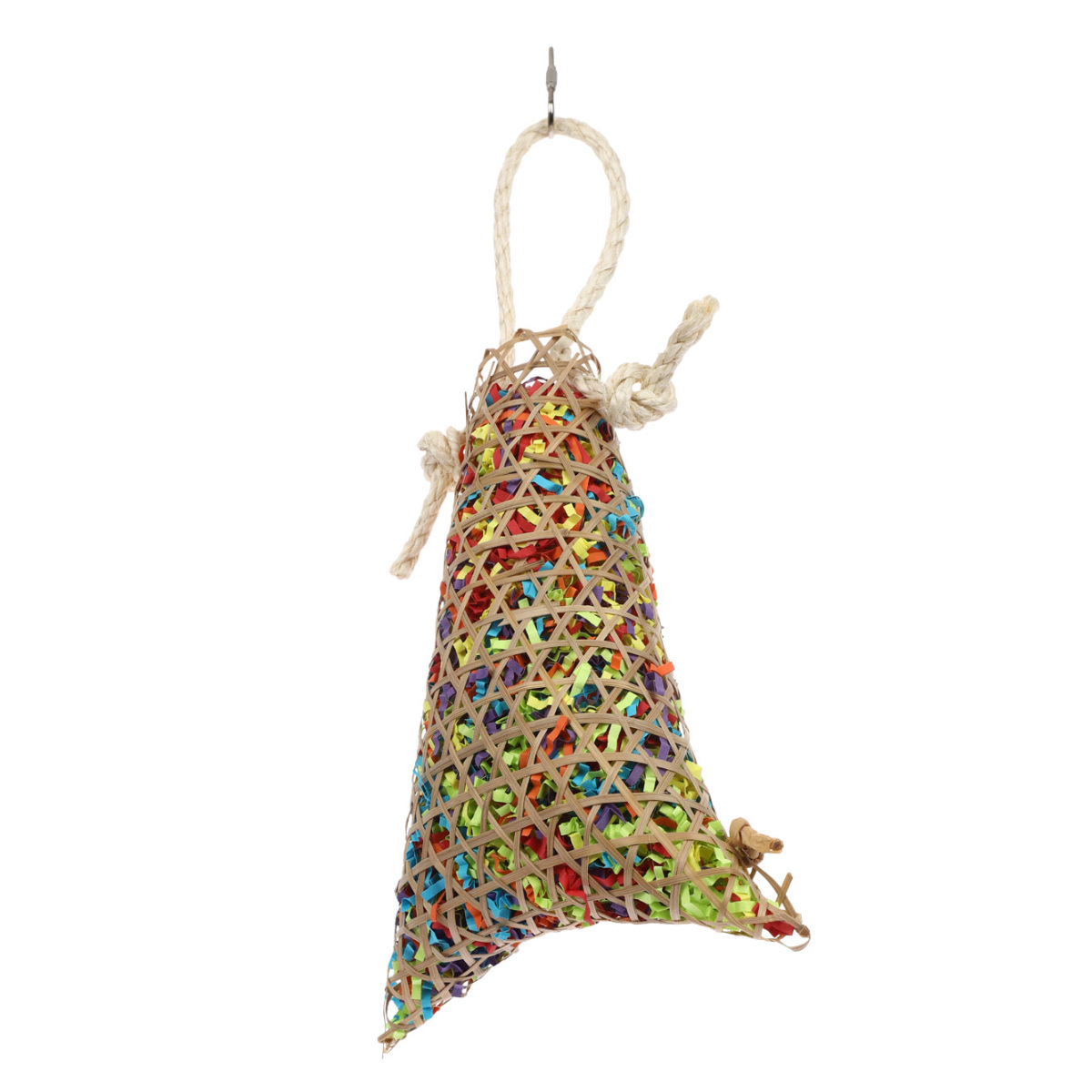 細い竹で編んだかごに、カラフルな短冊状の紙がギッシリ詰まった鳥用おもちゃです。餌や巣材を探したり、虫を突いたりする本能を刺激します。自然素材でできているので、つっついても、噛んでも、かじっても安全です。