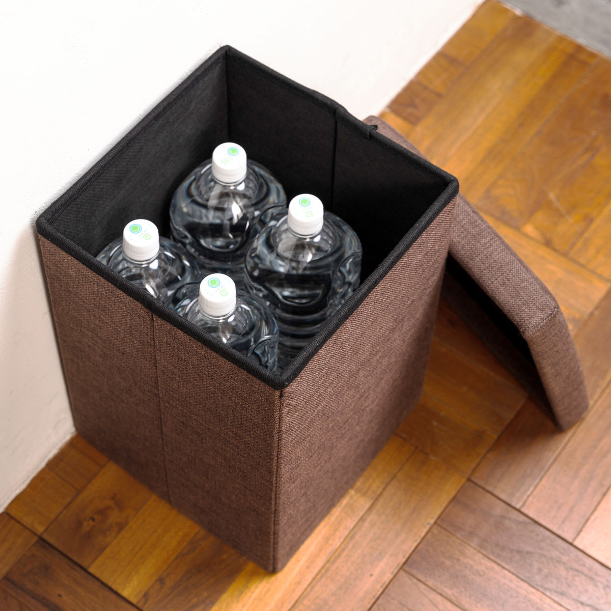フタを閉めれば生活感を隠せるので、食品・日用品ストック、防災グッズ、おもちゃなど、さまざまな形や大きさのアイテムをざっくり収納できます。2Lのペットボトル4本がすっぽり入るサイズです。