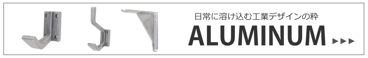 飾らずとも主張するアルミニウムシリーズのブラケットは、どこか鉄道や船舶、公共施設で使われていたような工業的なデザインです。素材の重厚感を残しつつもシンプルで機能性のあるフォルムのブラケットは、どんな棚板にもあわせやすいシルバーカラーです。