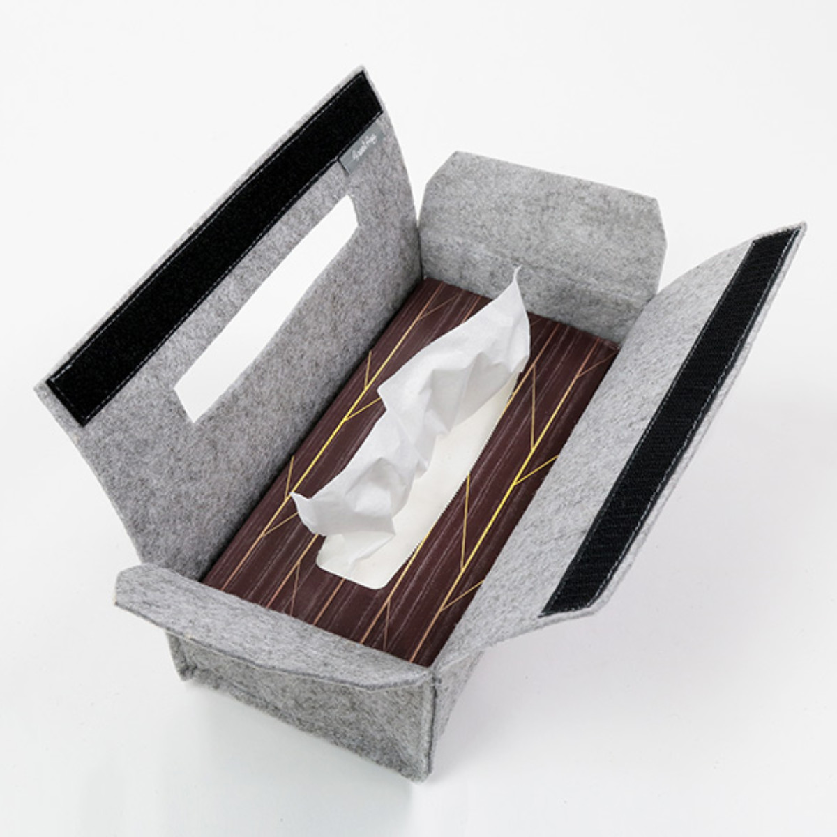 面ファスナー式なので出し入れがしやすいです。ボックスティッシュが1箱入ります。