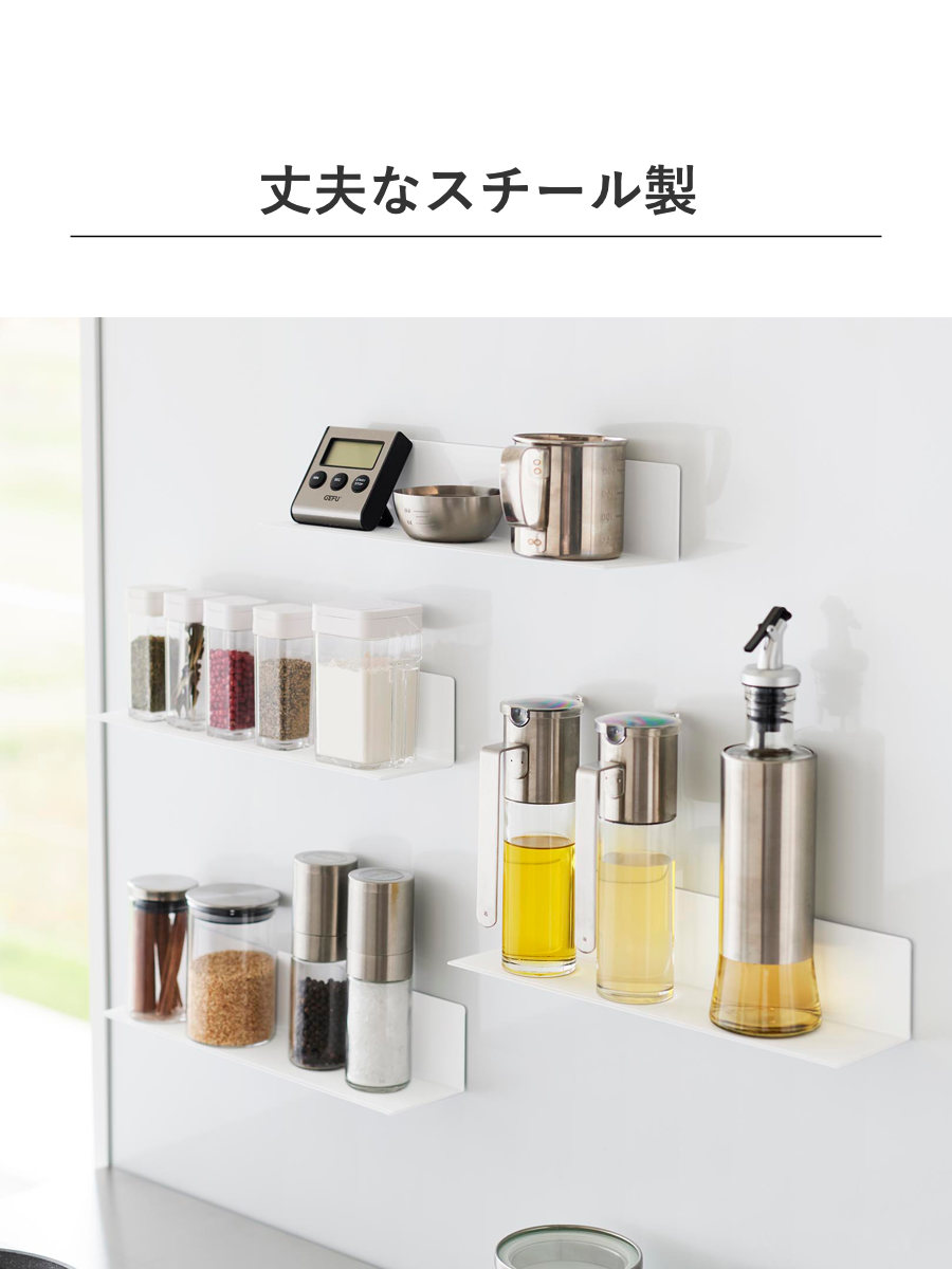 マグネットで簡単に取り付けできるコンパクトサイズのキッチン棚です。調味料やスパイス、オイルなどいつも使うものをまとめて置けて使うときにサッと取り出せて便利です。浮かせて収納することで、毎日のお掃除もラクラクです。