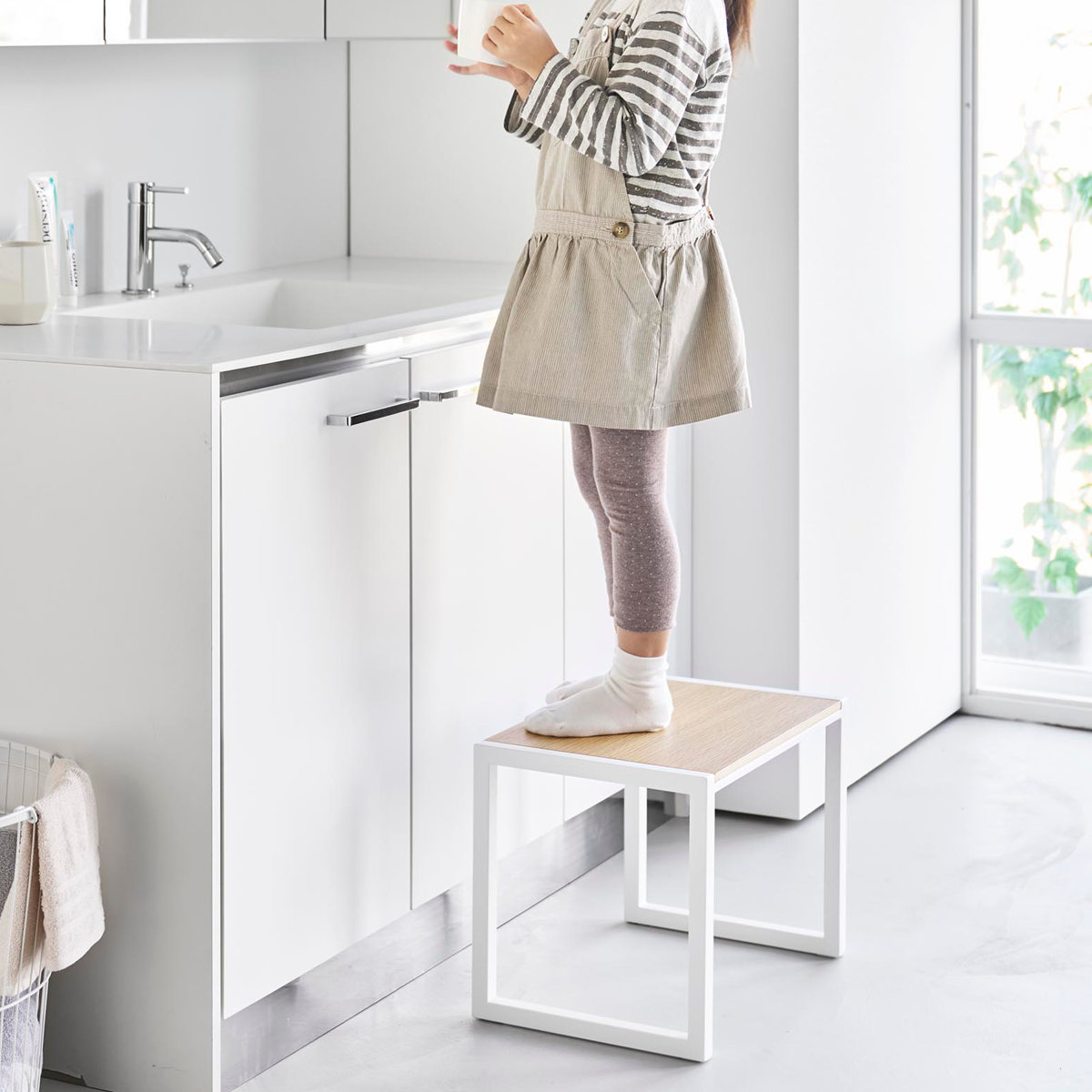 洗面台では、小さなお子様の手洗いやうがいのサポートとしても使えます。