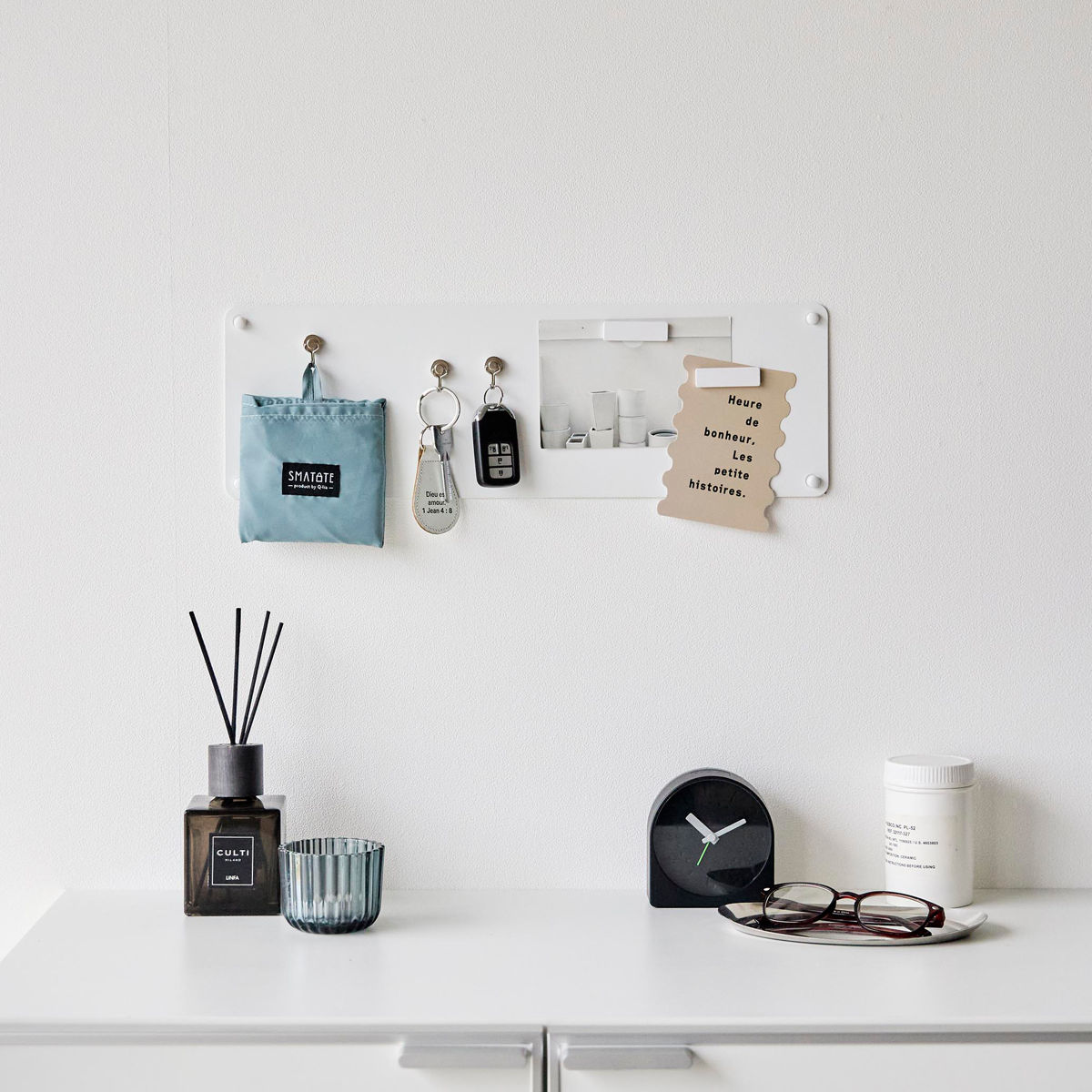 玄関に設置してお手持ちのマグネットフックを付ければ鍵の収納スペースにもなります。