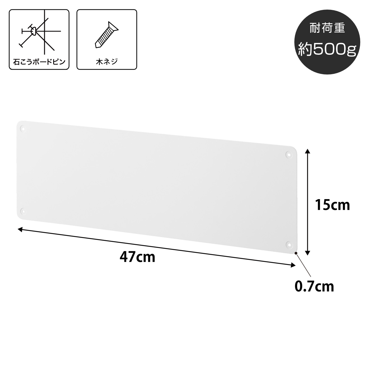 | 備考 | 取り付け可能な壁 石こうボードピン使用時:壁紙・布壁紙・ビニール壁紙貼りなどの石こうボード、薄ベニヤ 木ネジ使用時:柱・板壁(厚さ1cm以上)・プリント合板(裏側に水平にサンがある場所)・裏に下地材(間柱)が入っている壁 |